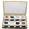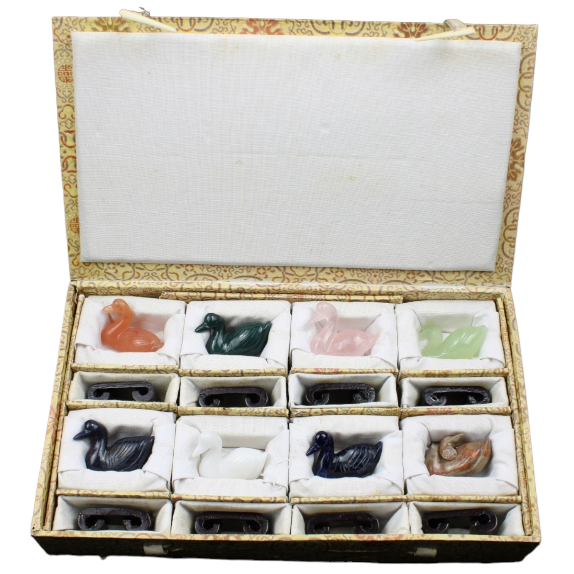 SCATOLA contenente segnaposto in pietra dura scolpita a forma di cigno XX secolo . Rotture h cm 16 x 27/ cigni h cm 3 x 4,5