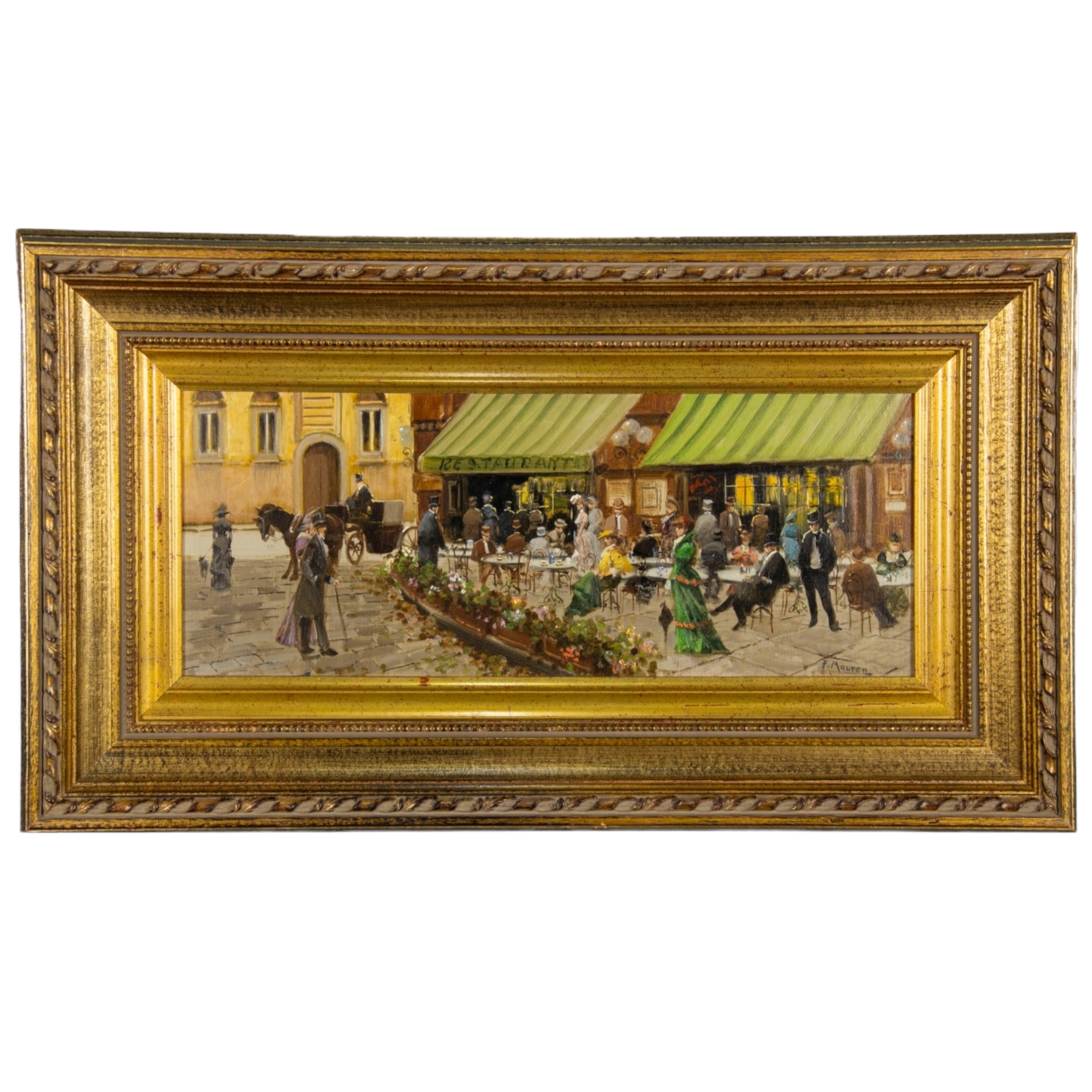 DIPINTO OLIO SU TAVOLA AU RESTAURANT firmato in basso a d/x Mauren cornice coeva XX secolo scuola francese h cm 40 x 70 / h cm 19 x 49