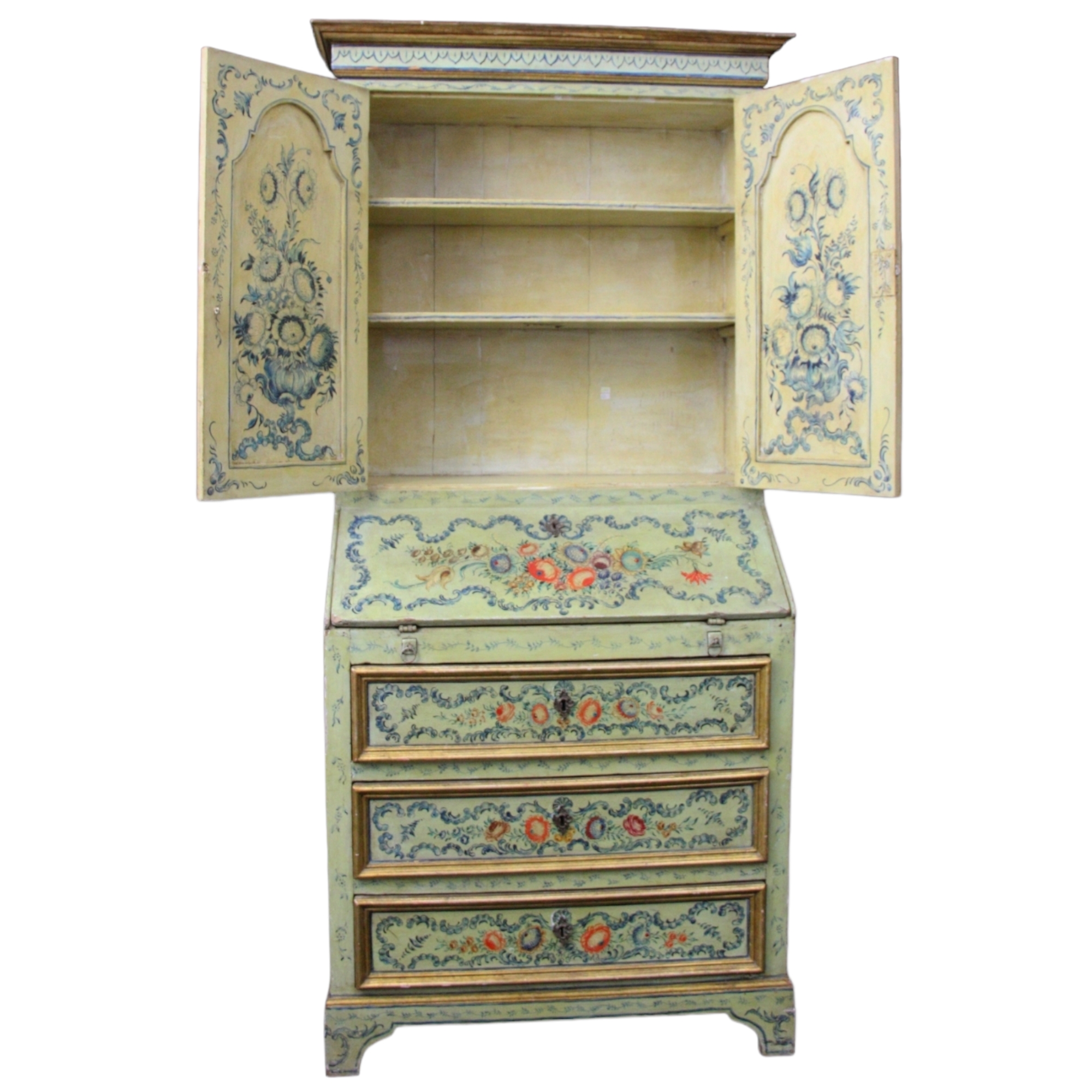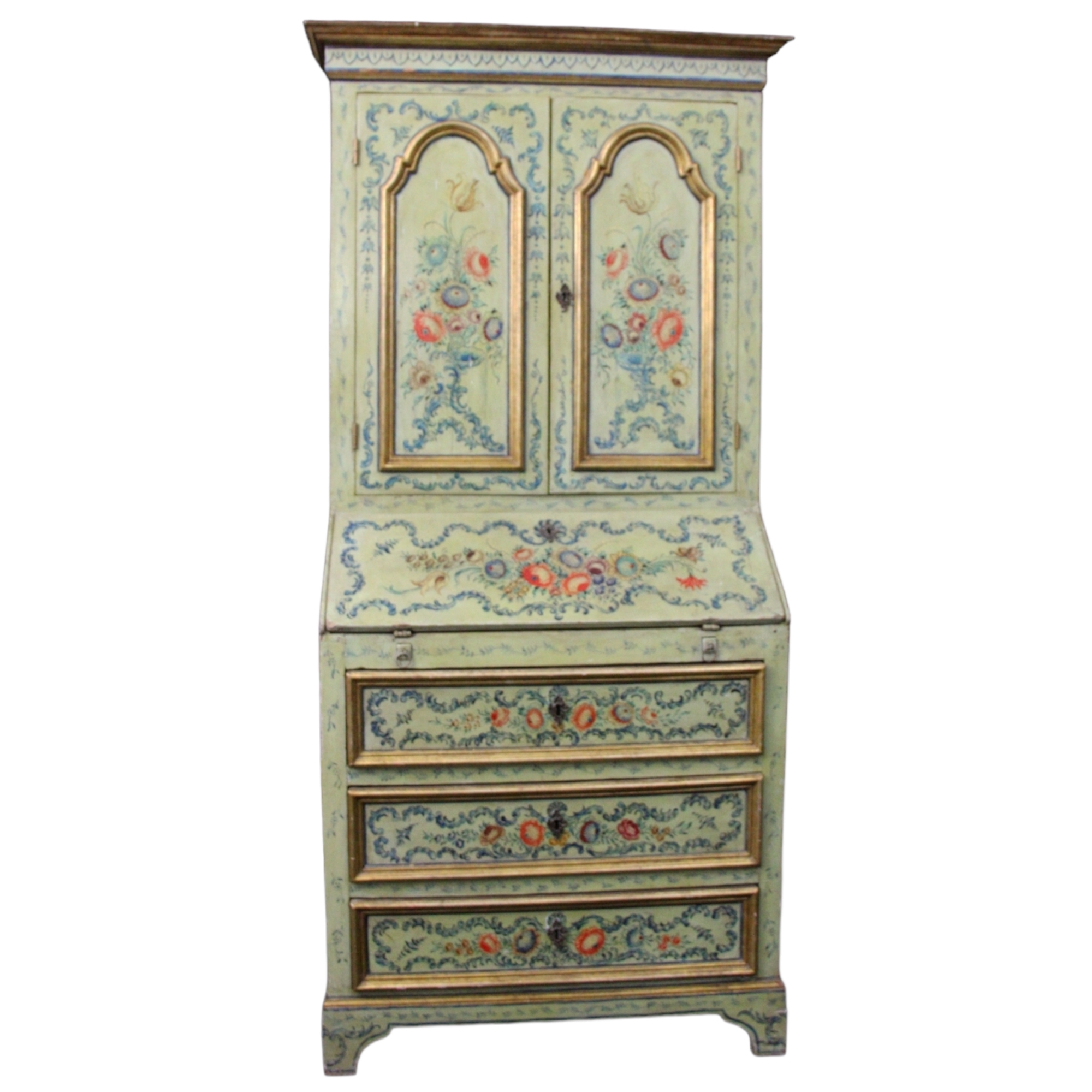 TRUMEAU RICCAMENTE DECORATO da pitture a carattere floreale dentro riserve dorate, il corpo basso presenta calatoia e 3 tiretti,la parte alta con 2 ante con cimasa dorata. XIX secolo Sicilia. h cm 196 x 85 x 47