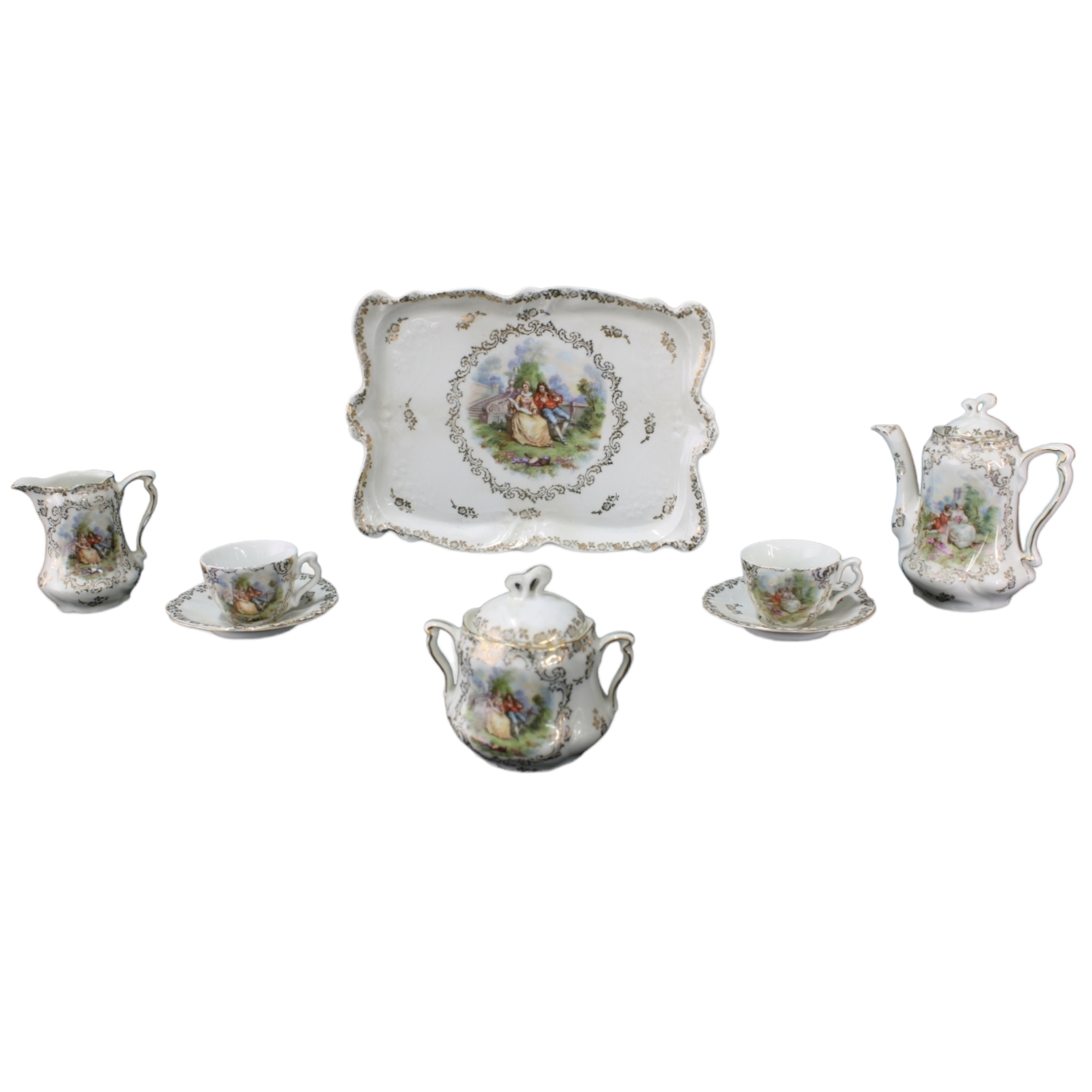 SERVIZIO DA CAFFE IN PORCELLANA COMPOSTO DA:, tazza con piattino e vassoio decorati da scene galanti Primi '900 misure varie
