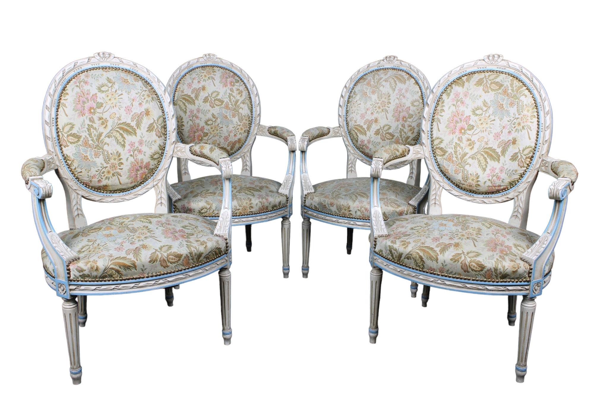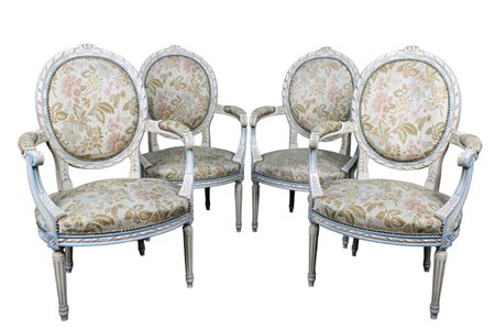 GRUPPO DI 4 POLTRONE laccate avorio e azzurro stile Luigi XVI. Francia XX secolo h cm 98 x 64 x 54