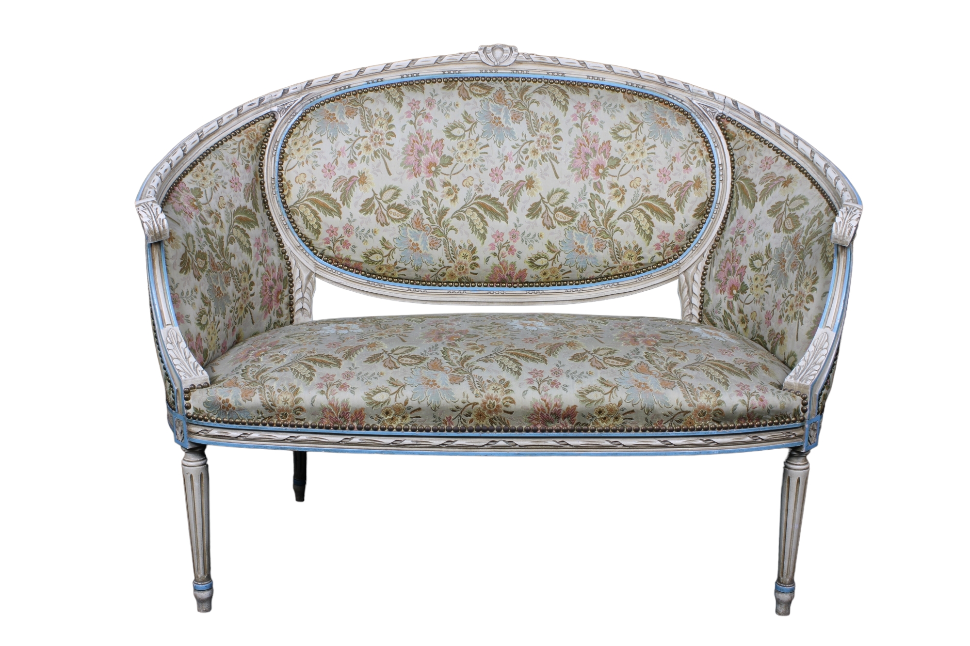 DIVANO CORBEILLE laccato avorio e azzurro stile Luigi XVI Francia XX secolo h cm 93 x 122 x 65