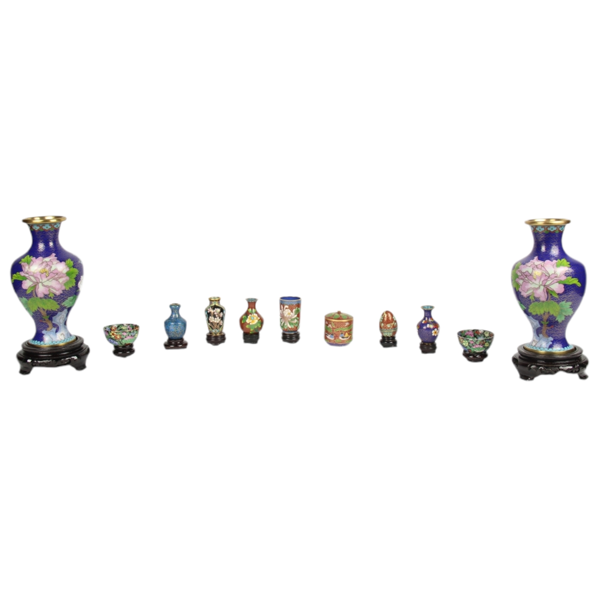 11 OGGETTI ORIENTALI IN CLOISONNE COMPOSTI DA: COPPIA DI VASI E 9 OGGETTI XX secolo misure varie