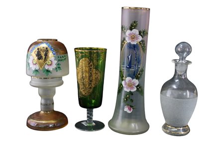 LOTTO DI 4 OGGETTI IN VETRO COMPOSTO DA: 01 vaso, 1 bottiglia, 1 calice e 1 vaso vecchia fattura misure varie