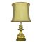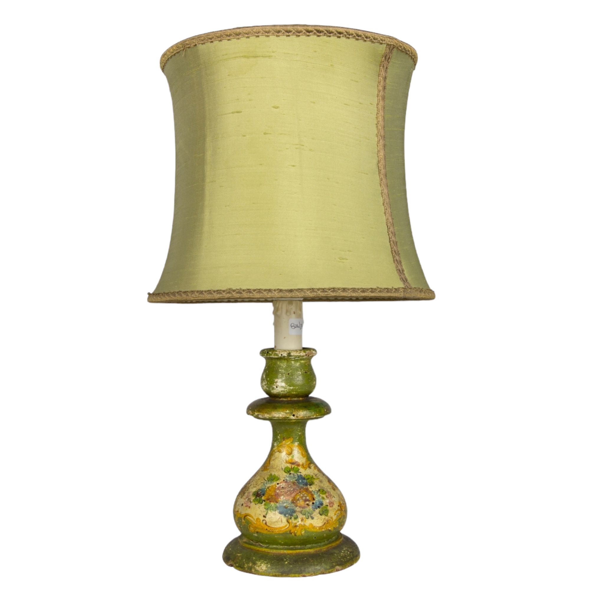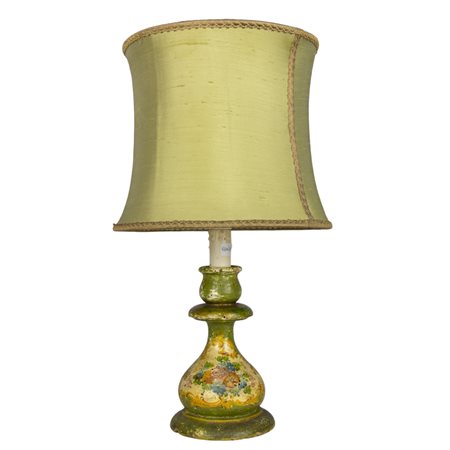 LUME DA TAVOLO realizzato in legno tornito laccato a fondo verde e finemente dipinto a motivi floreali paralume in tessuto Venezia XIX / XX secolo h cm 42 x 25