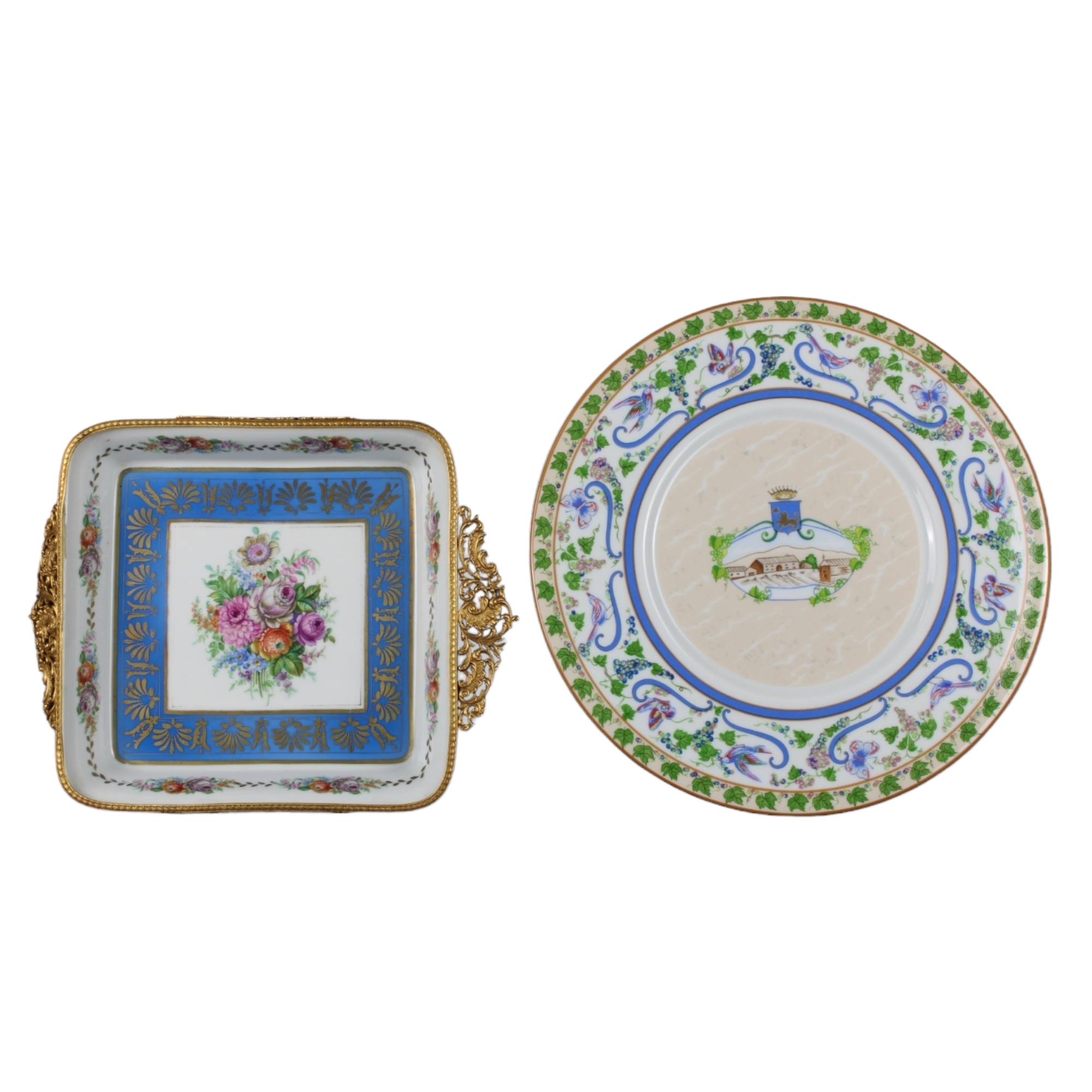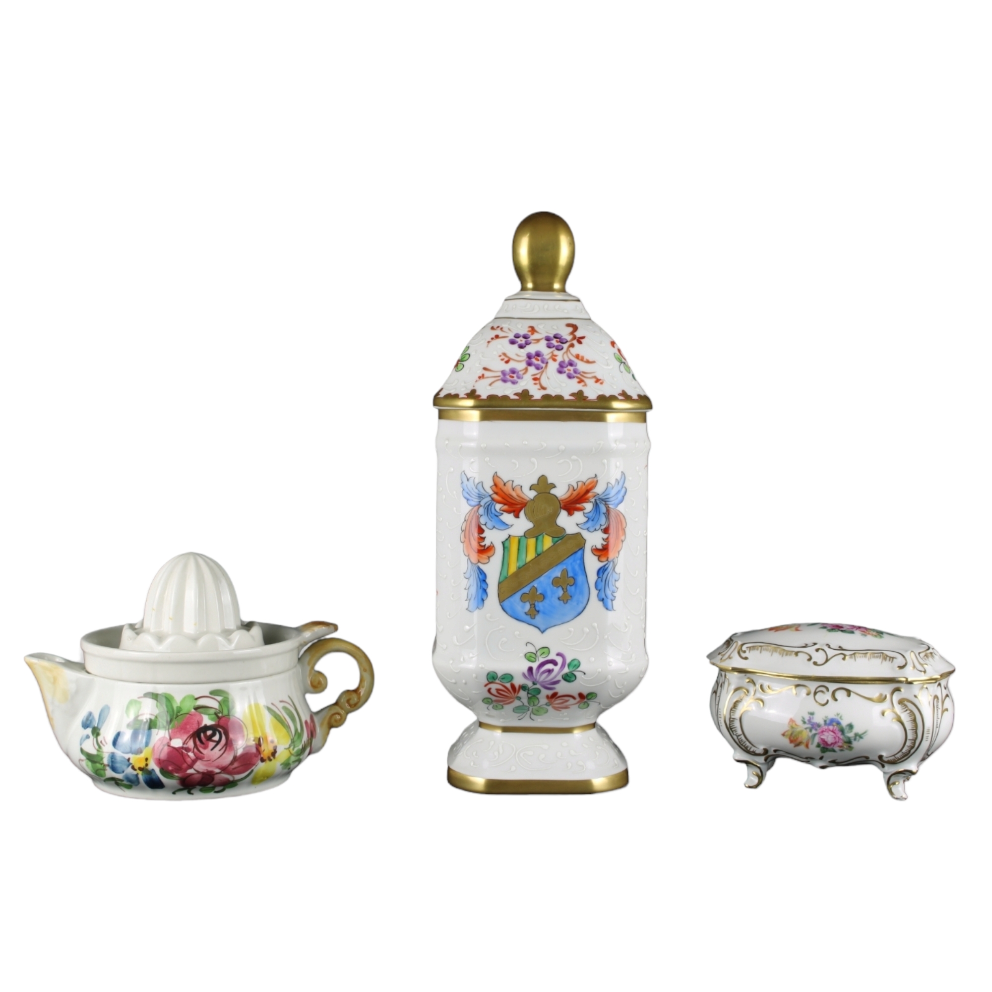 LOTTO DI 6 OGGETTI 5 in porcellana decorati da soggetti floreali ed 1 premi agrumi in ceramica porcellanata vintage