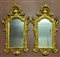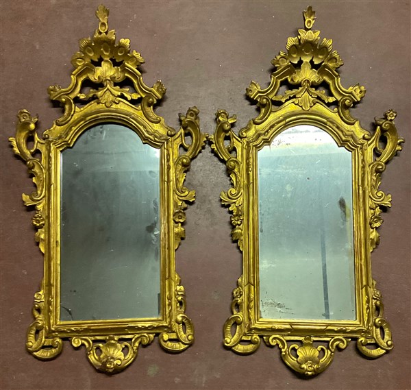 Coppia di specchiere in legno intagliato e dorato decorato da fregi a volute di foglie e fiori e cimasa traforata. Secolo XIX (cm 43x79) (difetti e restauri)