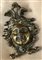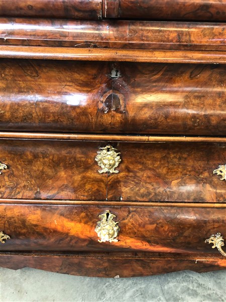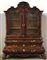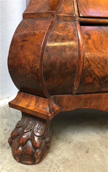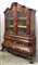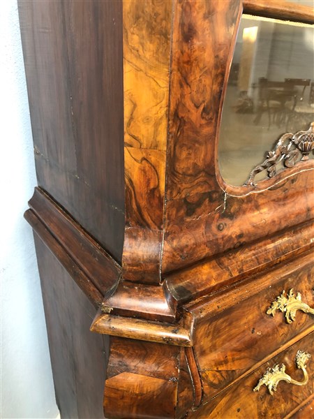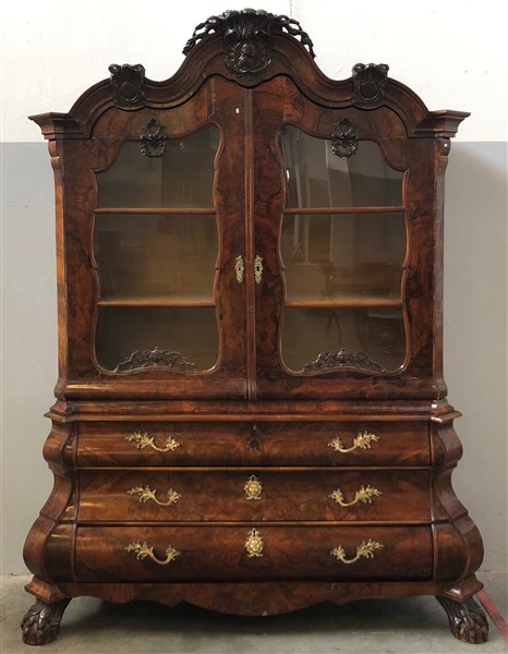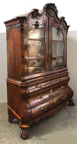 Mobile a doppio corpo di forma bombata lastronato in mogano con parte inferiore a tre cassetti con serrature a mascheroni, piedi ad artiglio su sfera. Parte superiore a due ante a vetro decorate da vasi, festoni e ghirlande. Cimasa scolpita e traforata, centrata da profilo di gentiluomo. Olanda, secolo XVIII (cm 190x251x69) (difetti)