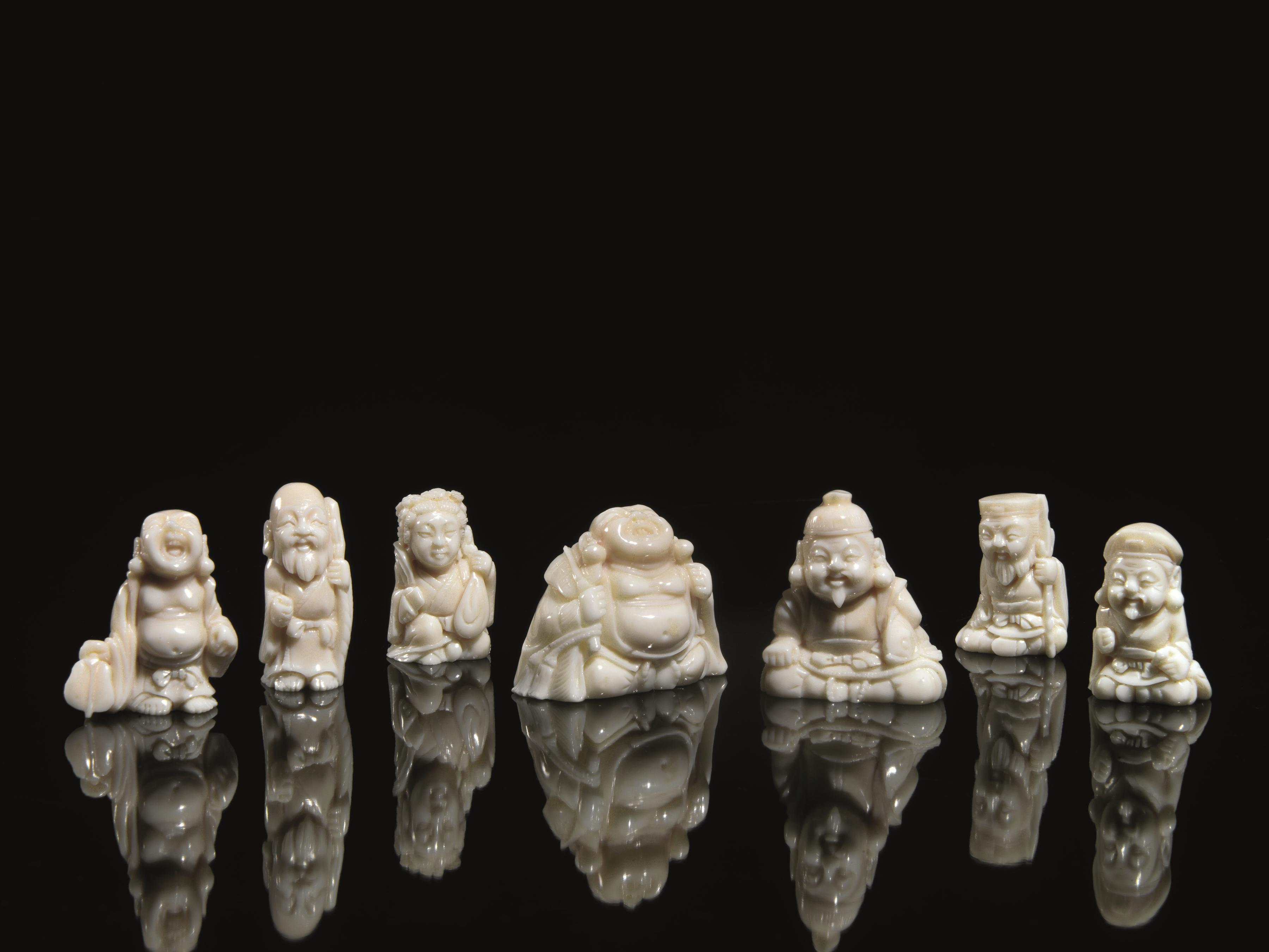 Sette piccole sculturine, Cina sec. XX, in corallo bianco raffiguranti...
