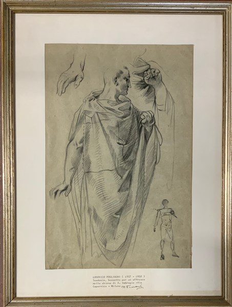 Lotto di due disegni di studio preparatorio per gli affreschi della chiesa di S. Ambrogio dell'Istituto Don Bosco di Milano, di cui uno disegnato anche al retro (cm 36x24) In cornice