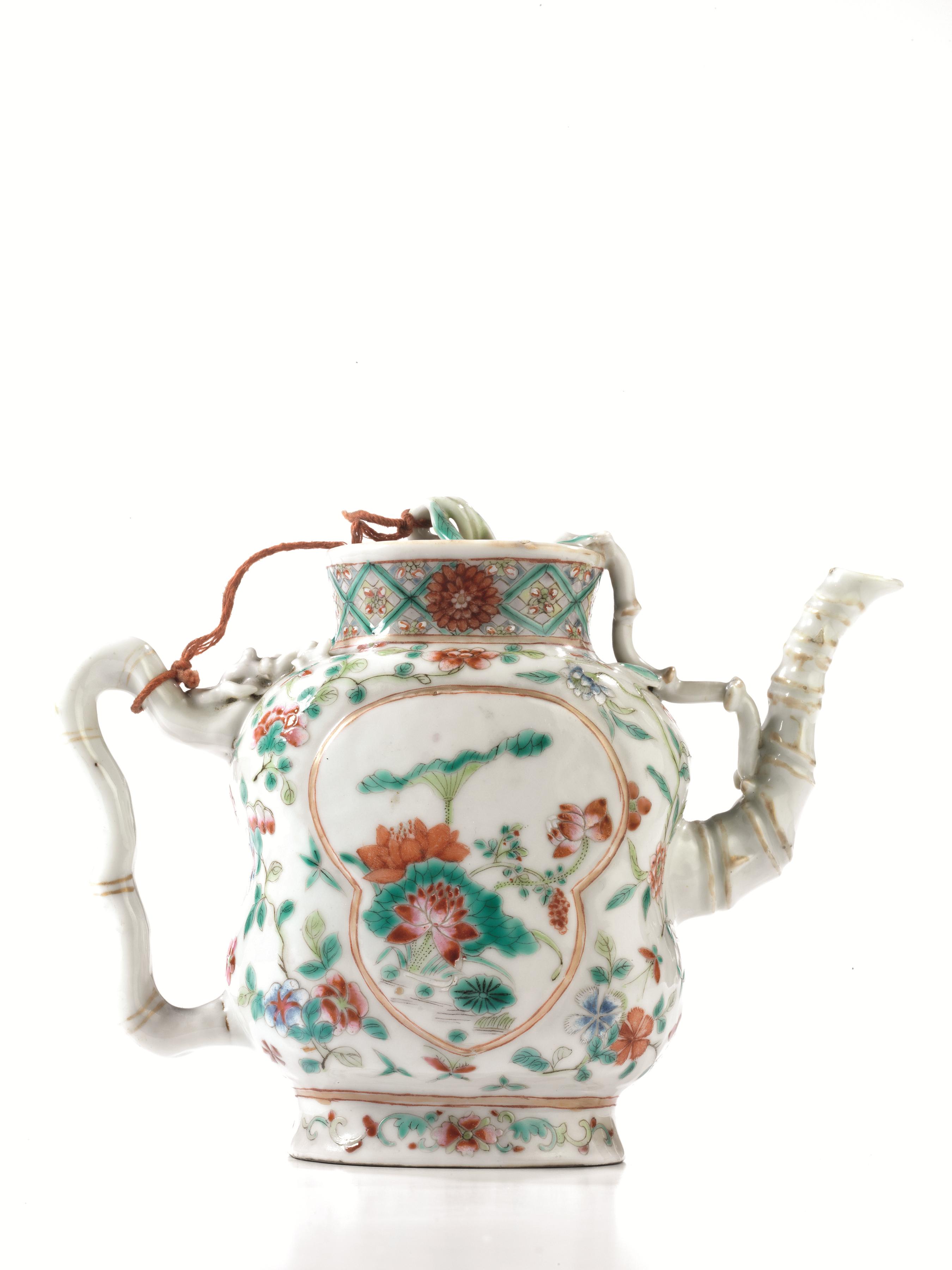 Teiera, Cina sec. XIX, in porcellana, famiglia rosa, finemente decorata a...