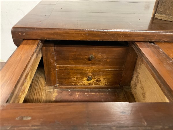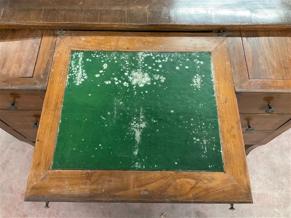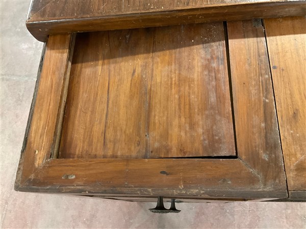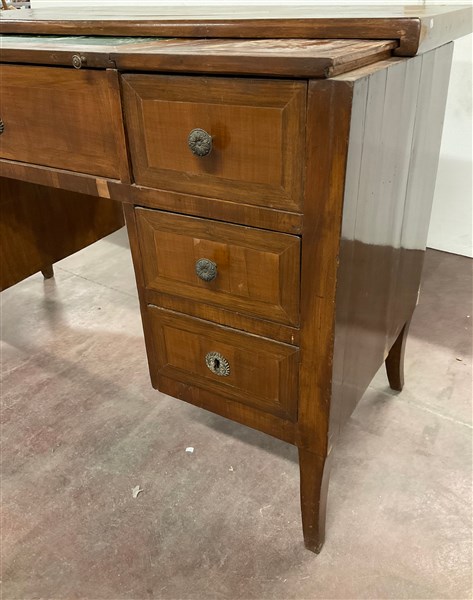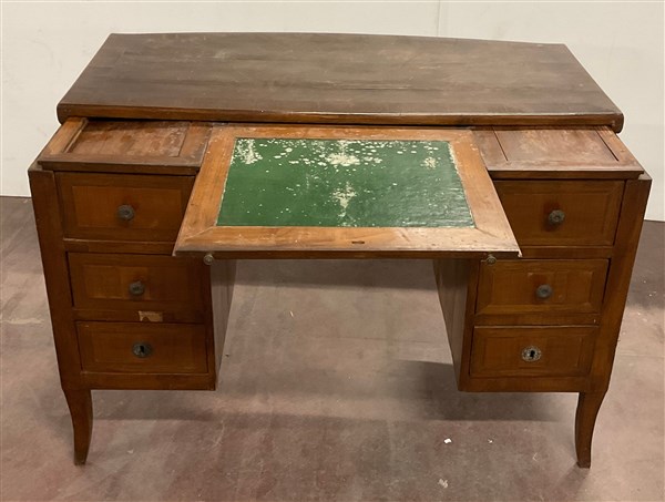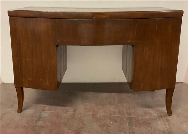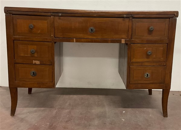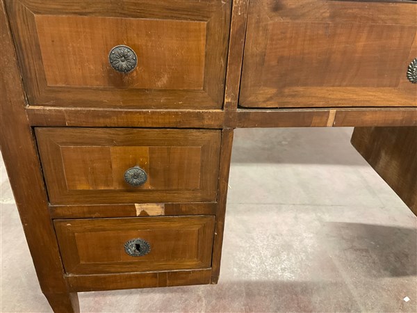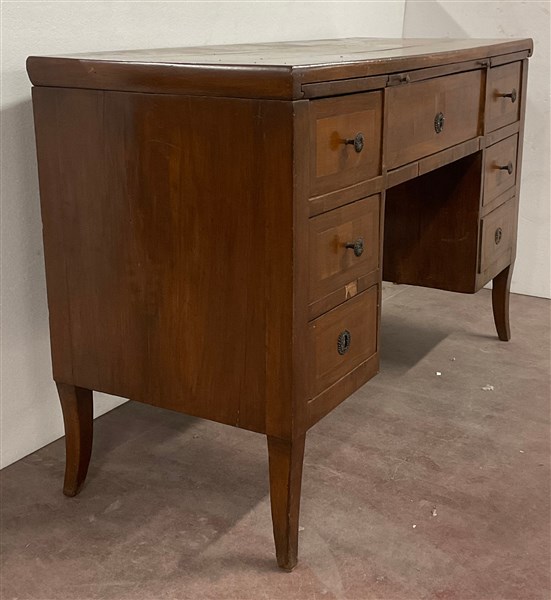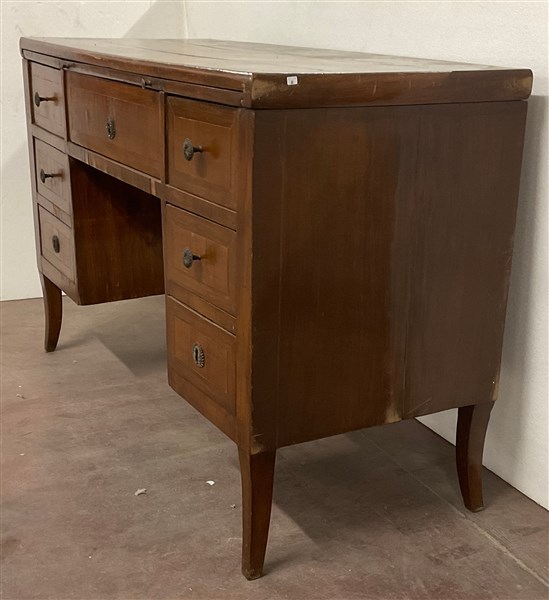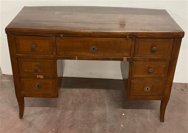 Scrivania da centro impiallacciata in legni vari con piano sagomato a sette cassetti e pianetto scorrevole (cm 122xh 82x59) (gravi difetti)