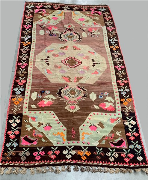 Tappeto Kilim Karabagh, Caucaso, secolo XX. Iscrizione in lettere cirilliche. Decoro con medaglione bianco con puntali su campo color tabacco. Angolari color verde acquamarina (cm 376x170) (difetti)