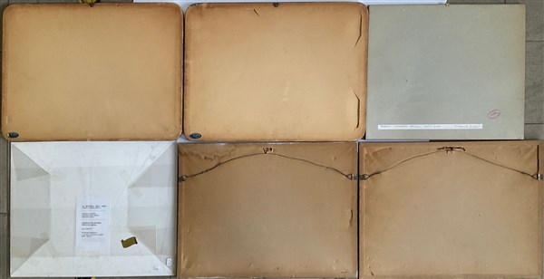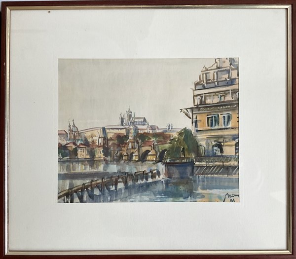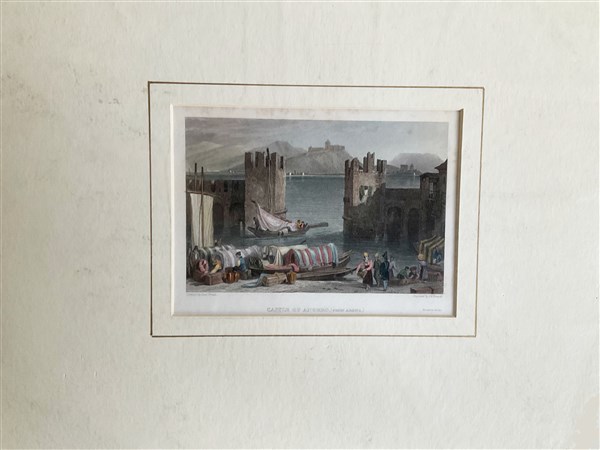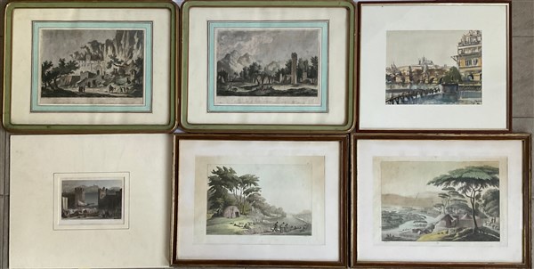Lotto composto da cinque incisioni diverse su carta raffiguranti paesaggi, di cui quattro in cornice, unite ad un acquerello su carta raffigurante veduta cittadina in cornice (difetti)