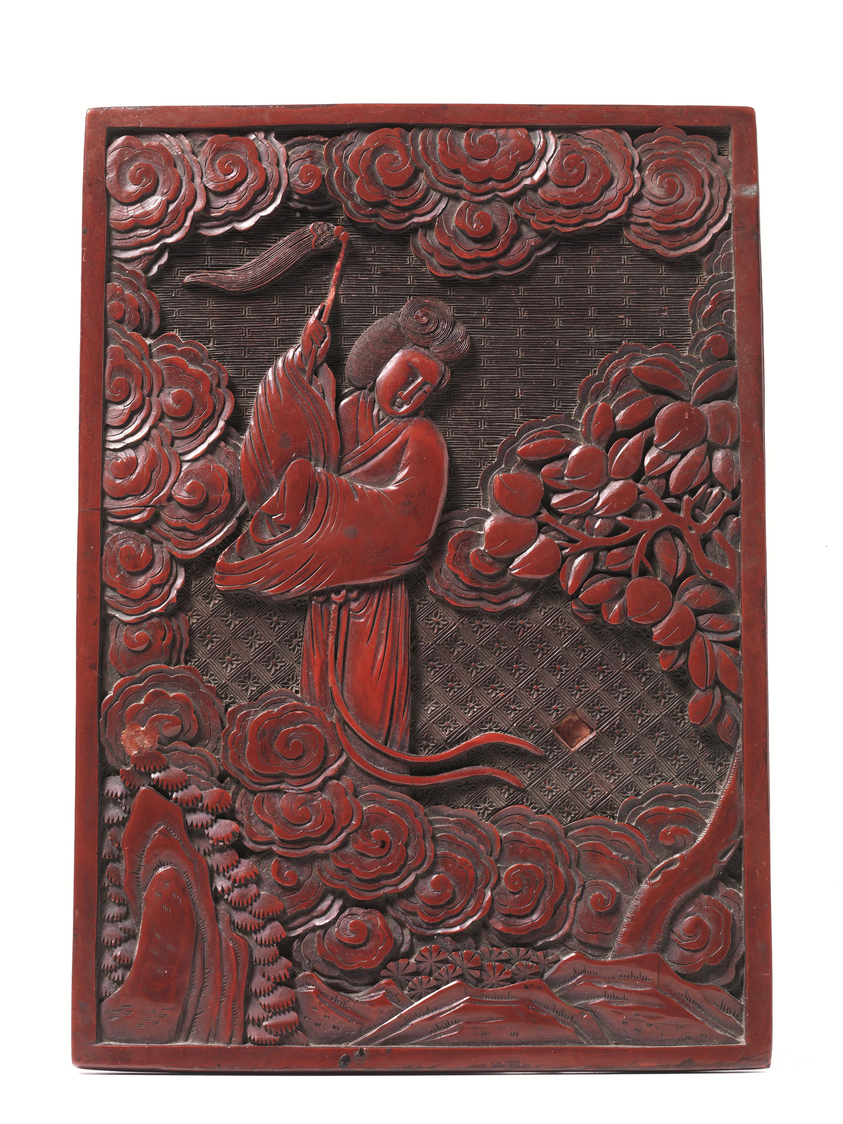 A Chinese red lacquered panel depicting a goddess, 19th c.