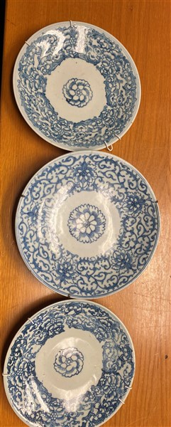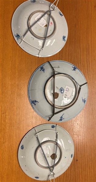 Lotto composto da tre piatti in porcellana bianca e blu. Cina, sec. XX (d. max