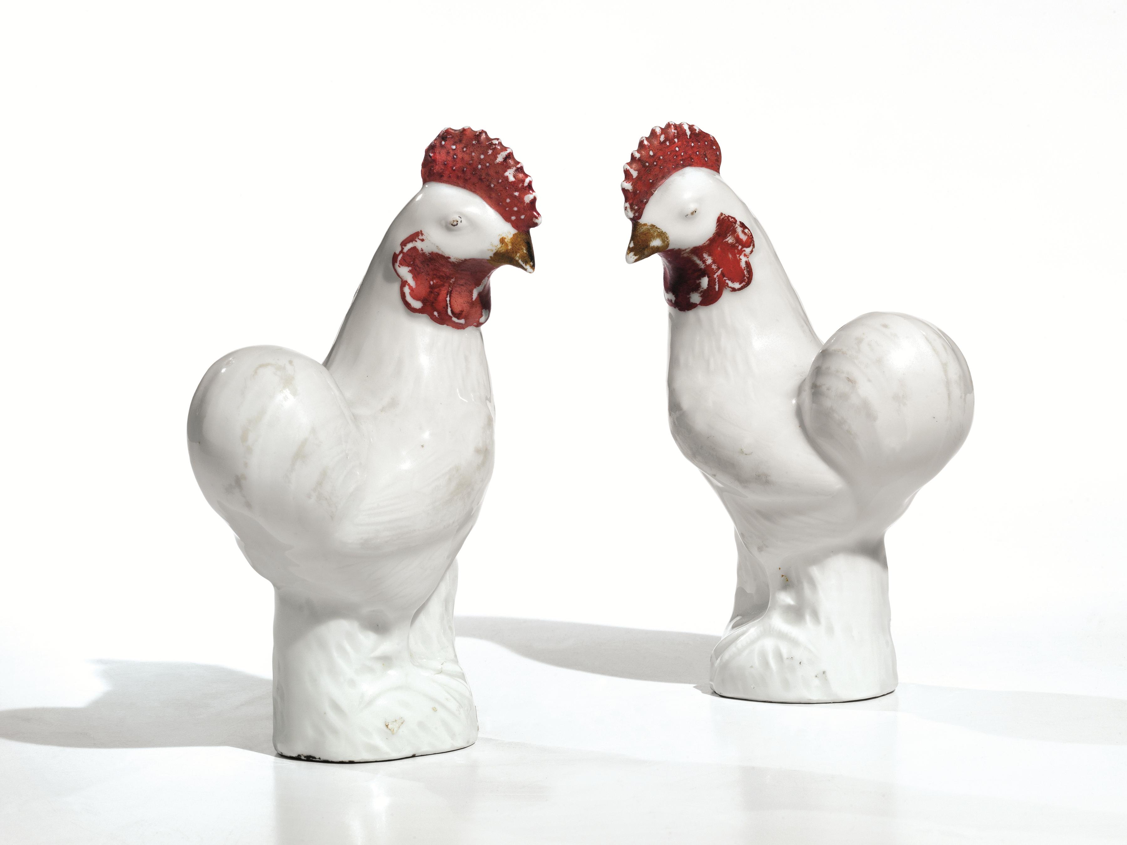 Coppia di fi gure di galli Cina, fi ne dinastia Qing, in porcellana bianca e...