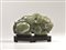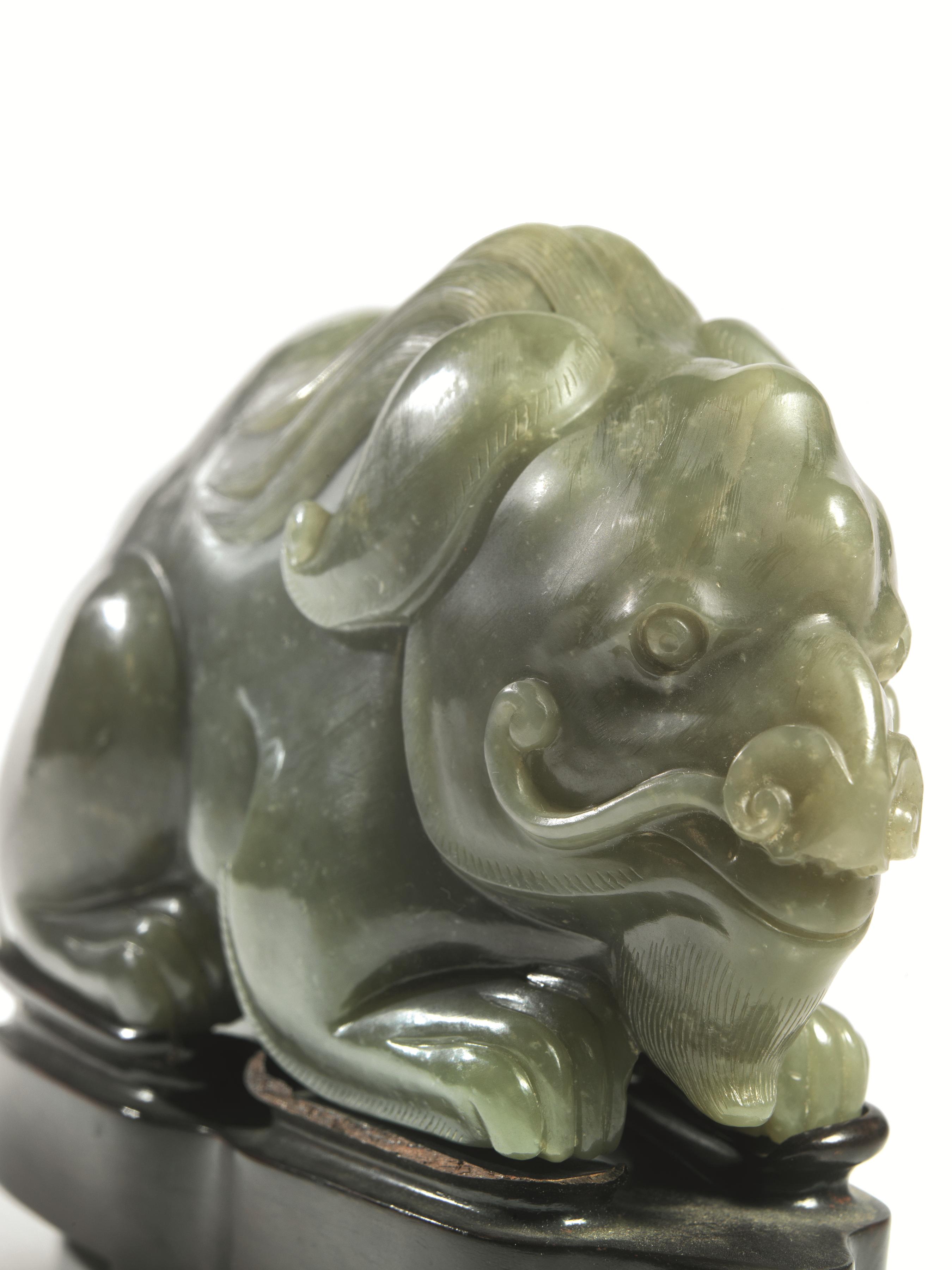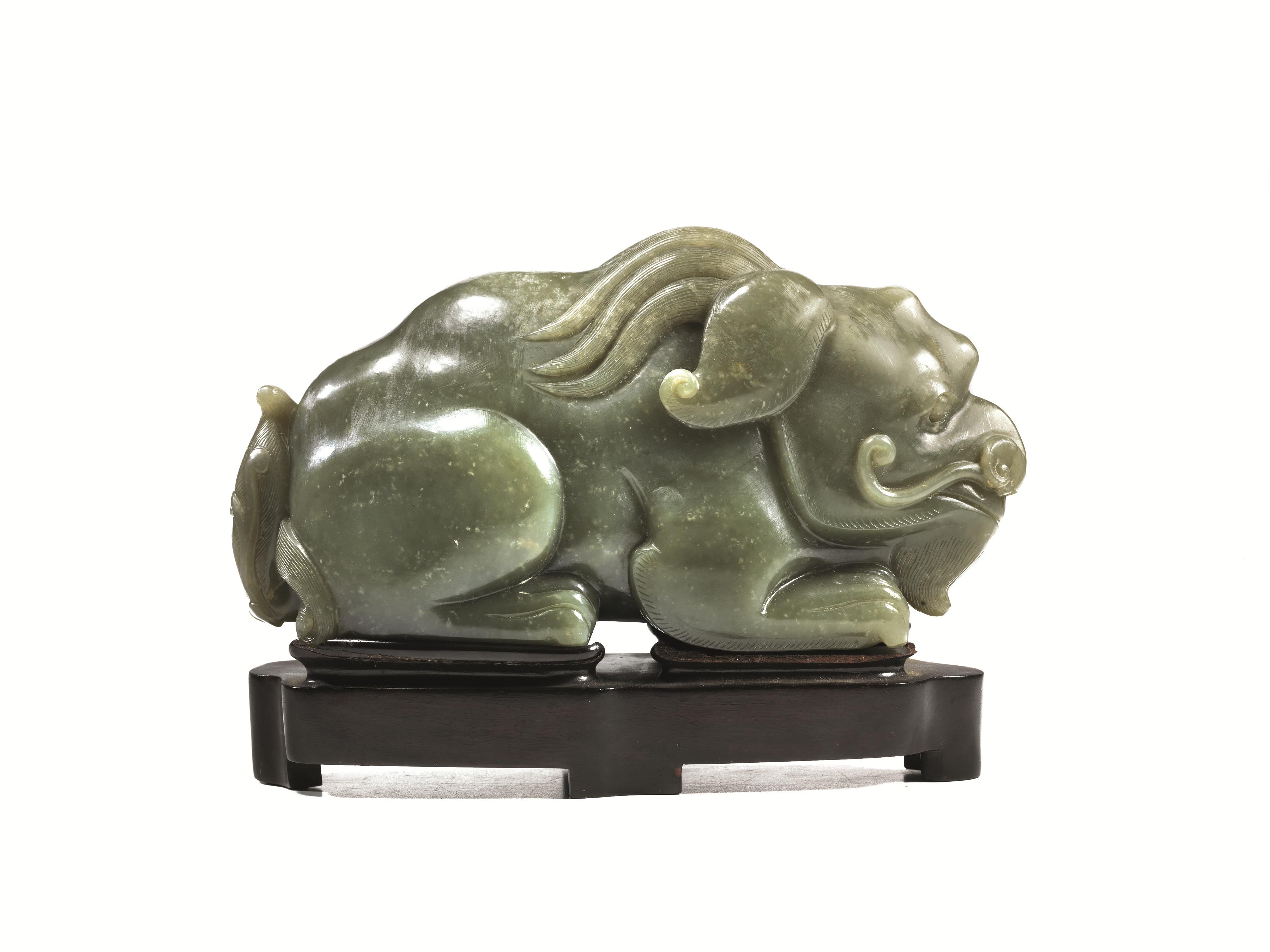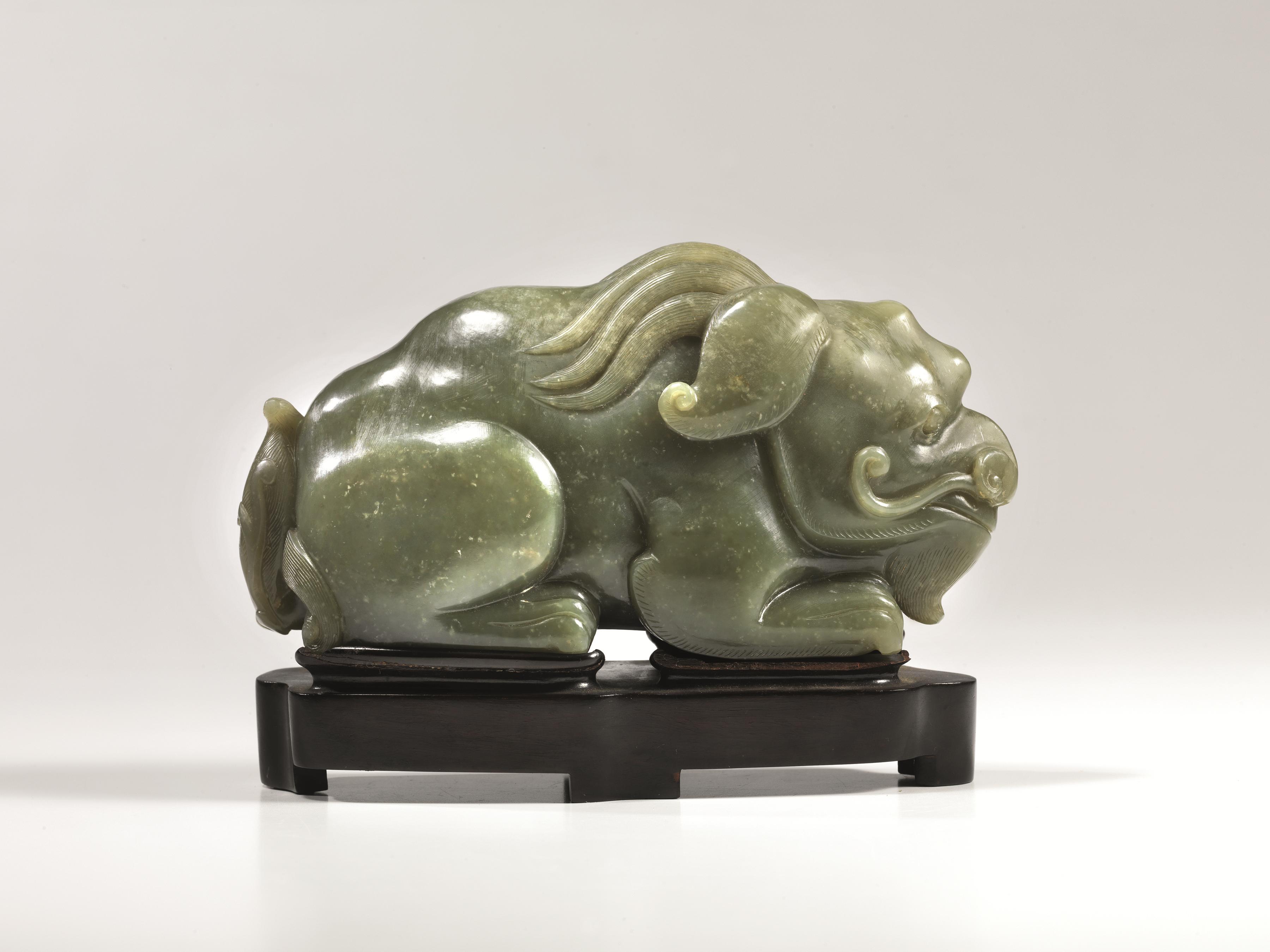 Qilin, Cina, sec. XIX, in giada verde celadon, in posizione accucciata, con base in legno, lung. cm 20