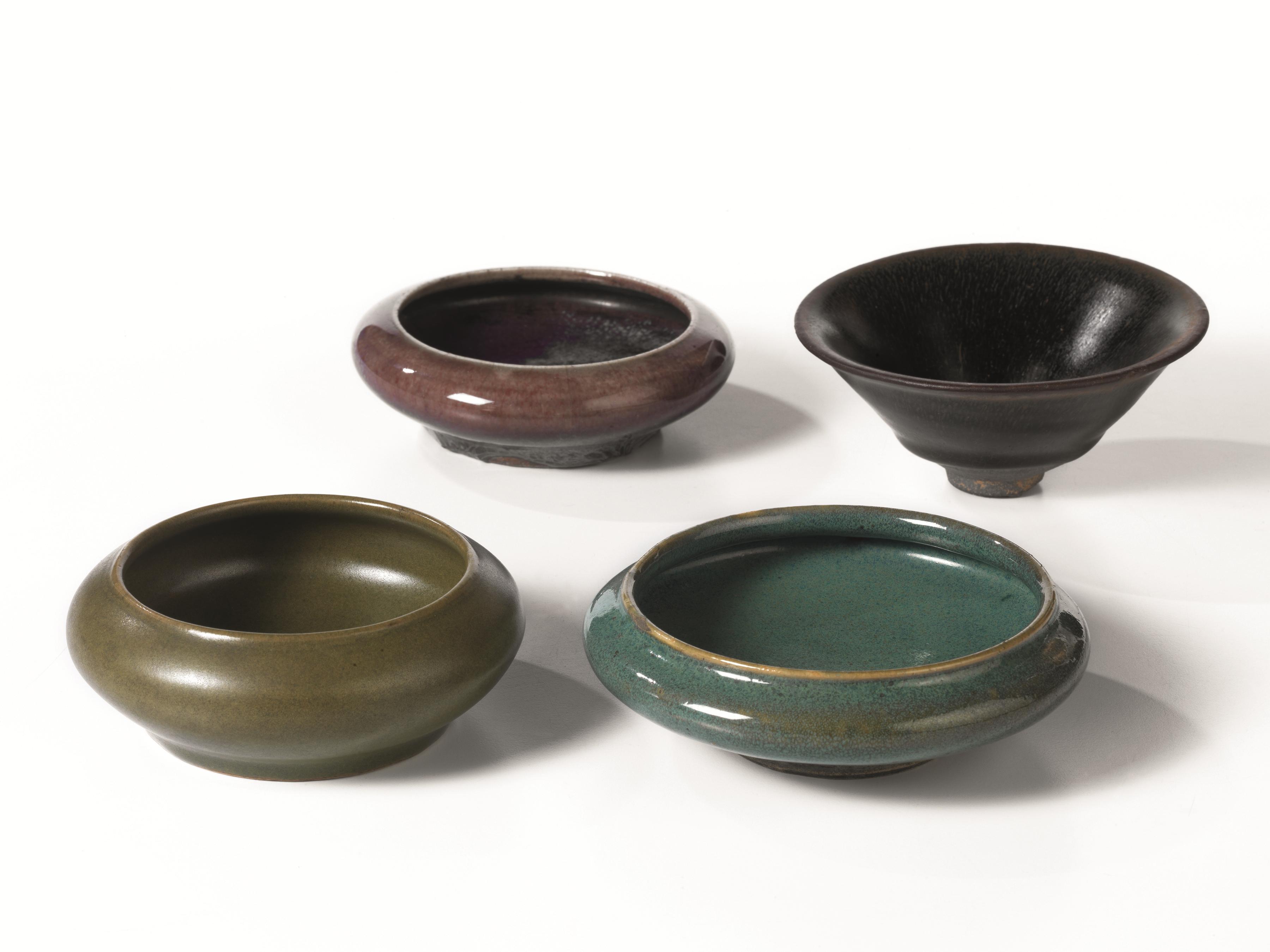 Due vaschette lava-pennelli, Cina sec. XX, in ceramica invetriata verde, diam cm 14,8; diam. cm 11,7 (2)