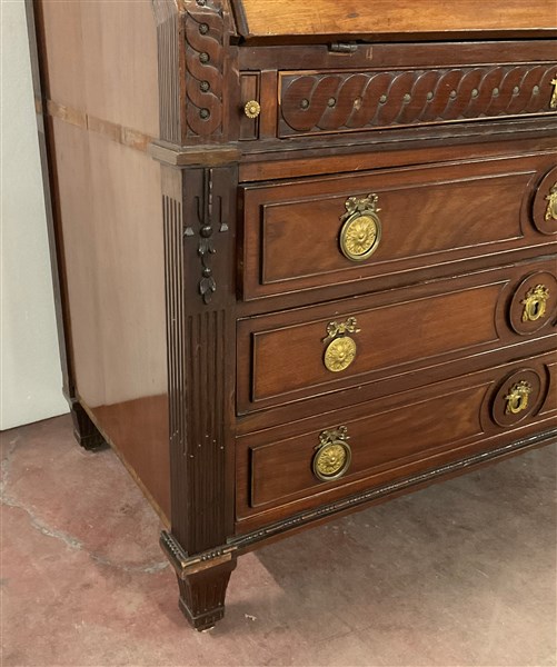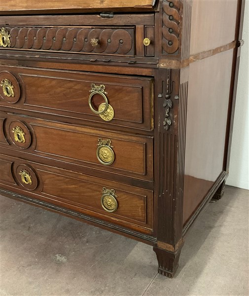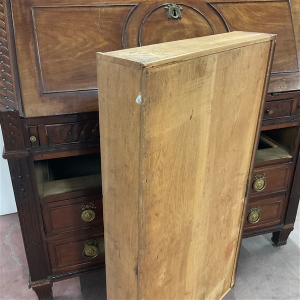 Ribalta in legno intagliato con fronte a tre cassetti sotto uno a mezza lunghezza. Calatoia celante vani e tiretti. Montanti intagliati e scanalati, piedi rastremati. Guarnizioni in metallo dorato (cm 113x113x59) (restauri)
