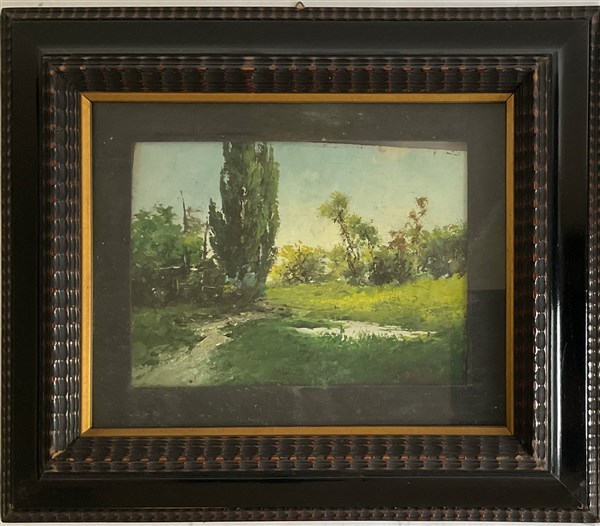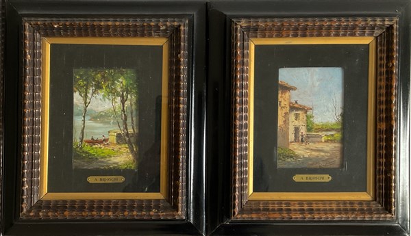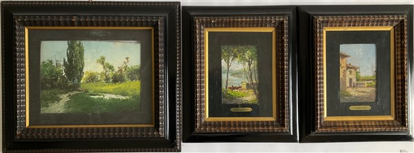 Lotto di tre dipinti ad olio su compensato di diversi autori e misure. In cornice
