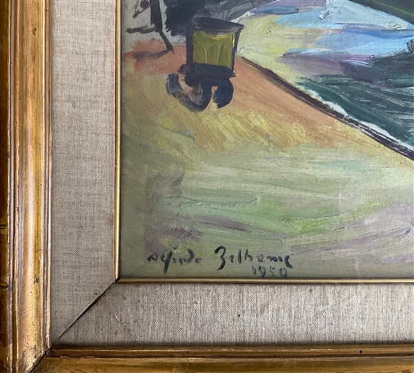 "Pont Sully, Paris" 1950, olio su cartone (cm 33x41) Firmato e datato in basso a sinistra. Al retro: titolo, luogo, firma, cartigli e timbri . In cornice