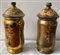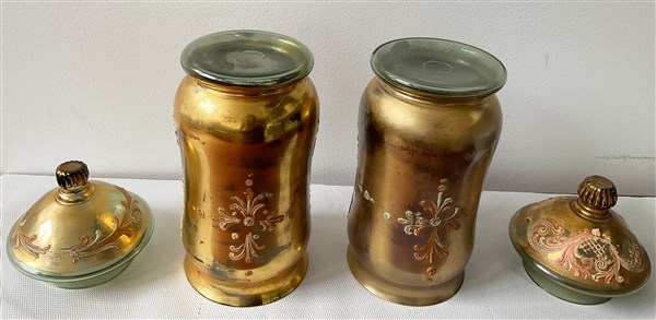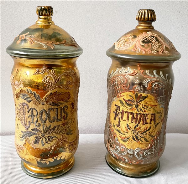 Coppia di vasi da farmacia in vetro dorato decorati in policromia con coperchi (h cm 30)(difetti)