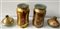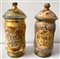 Coppia di vasi da farmacia in vetro dorato decorati in policromia con coperchi