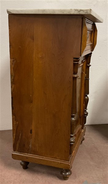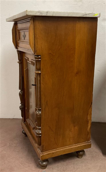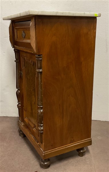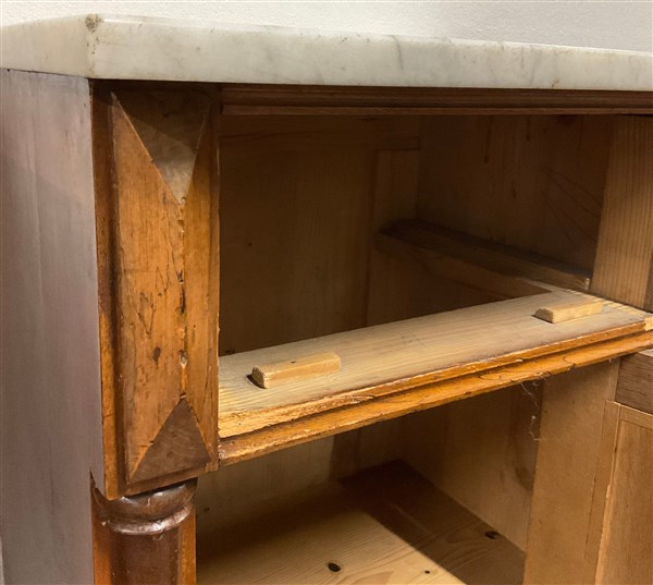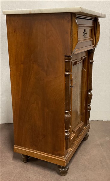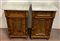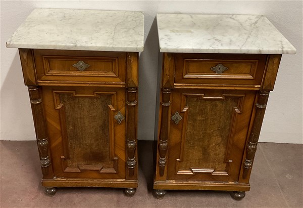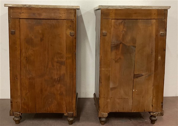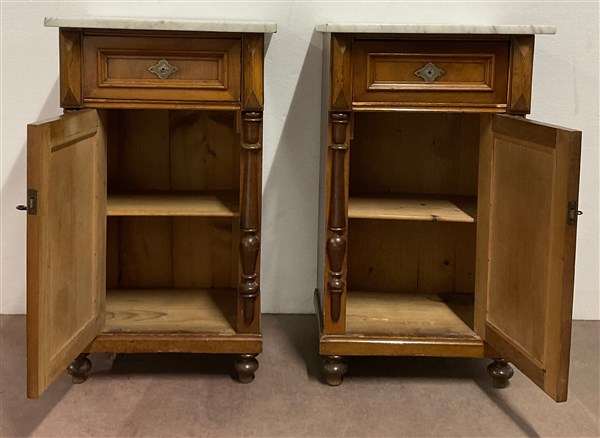 Coppia di comodini con fronte ad un'anta ed un cassetto pannellati, piedi a trottola. Piani in marmo (cm 48x82x38) (difetti)
