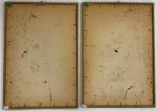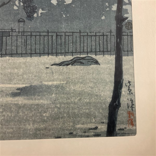 Due stampe giapponesi raffiguranti "Torre nella pioggia" e "Veduta di tempio", in cornici