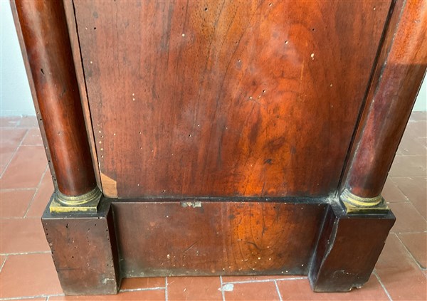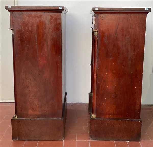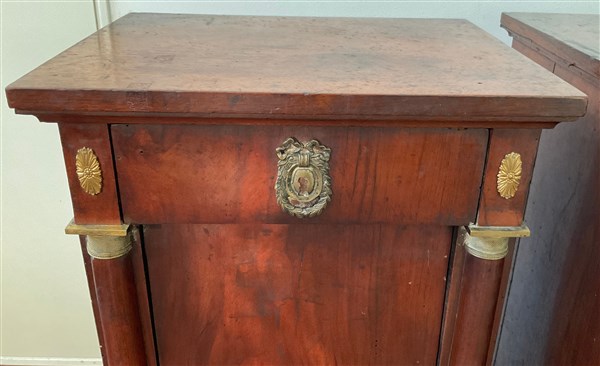 Coppia di comodini impero in legno tinto ad un'anta ed un cassetto sul fronte con applicazioni in metallo dorato (cm 42,5x79x31,5) (difetti e mancanze)