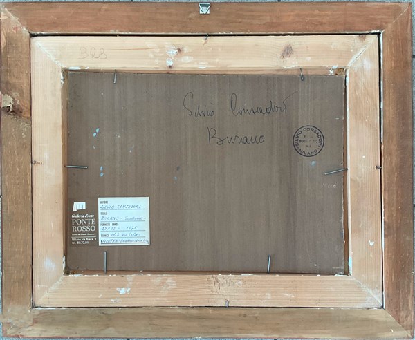 "Burano" olio su cartone (cm 25x35) Firmato in basso a destra. Al retro: firma, titolo, timbro dall'artista e cartiglio. In cornice