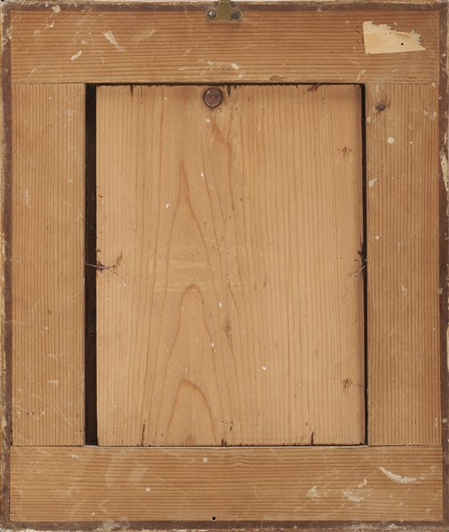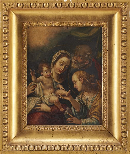 Scuola della fine del XVII secolo, Sacra Famiglia con Maria Maddalena, olio su rame (cm 22x16) in cornice in legno dorato del XIX secolo (difetti)