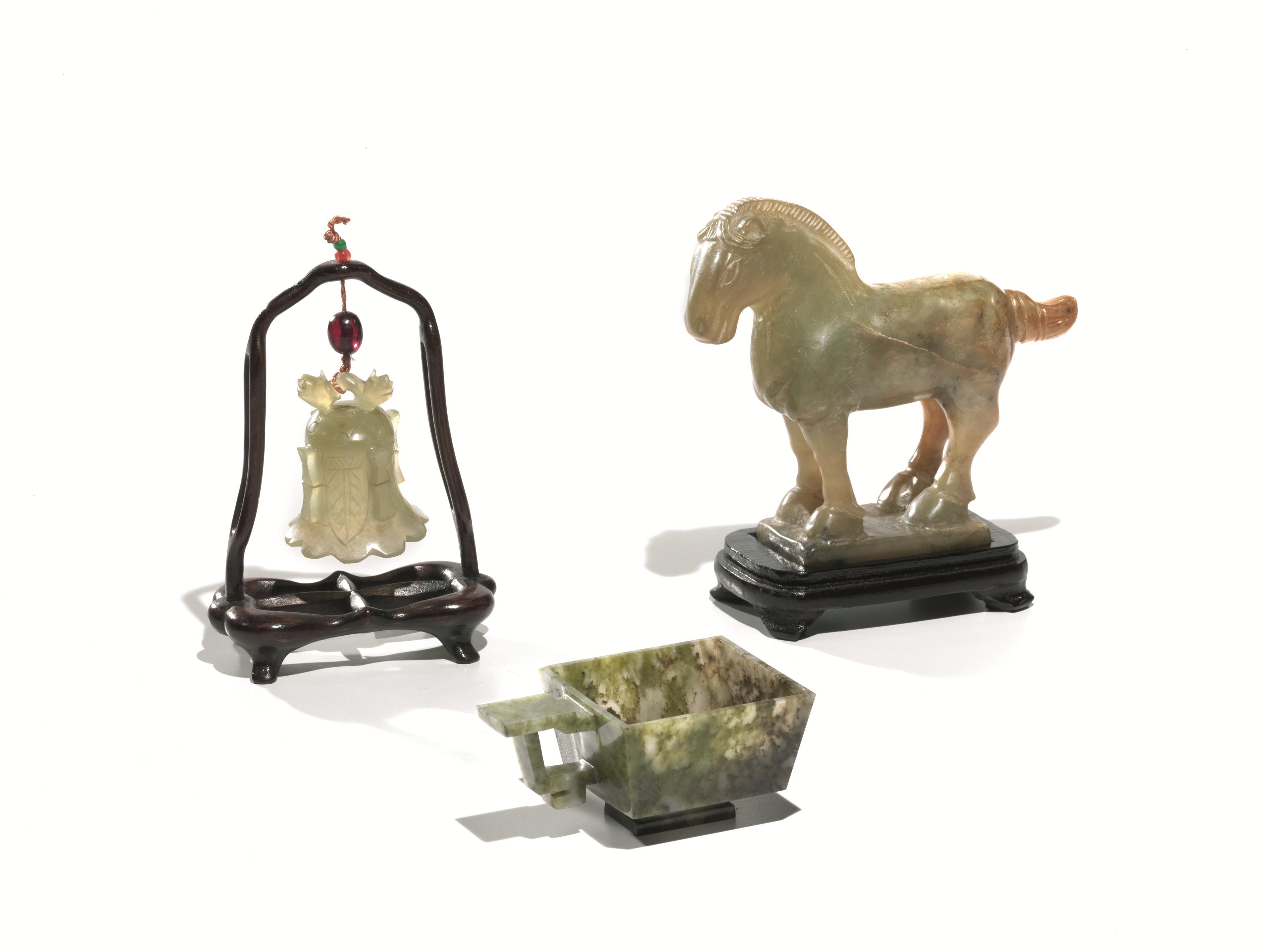 Tre oggetti, Cina inizi sec. XIX-XX, in giada verde modellati a coppetta, cavallo e campana, alt. cm 4, cm 11,5, alt. cm 5,5