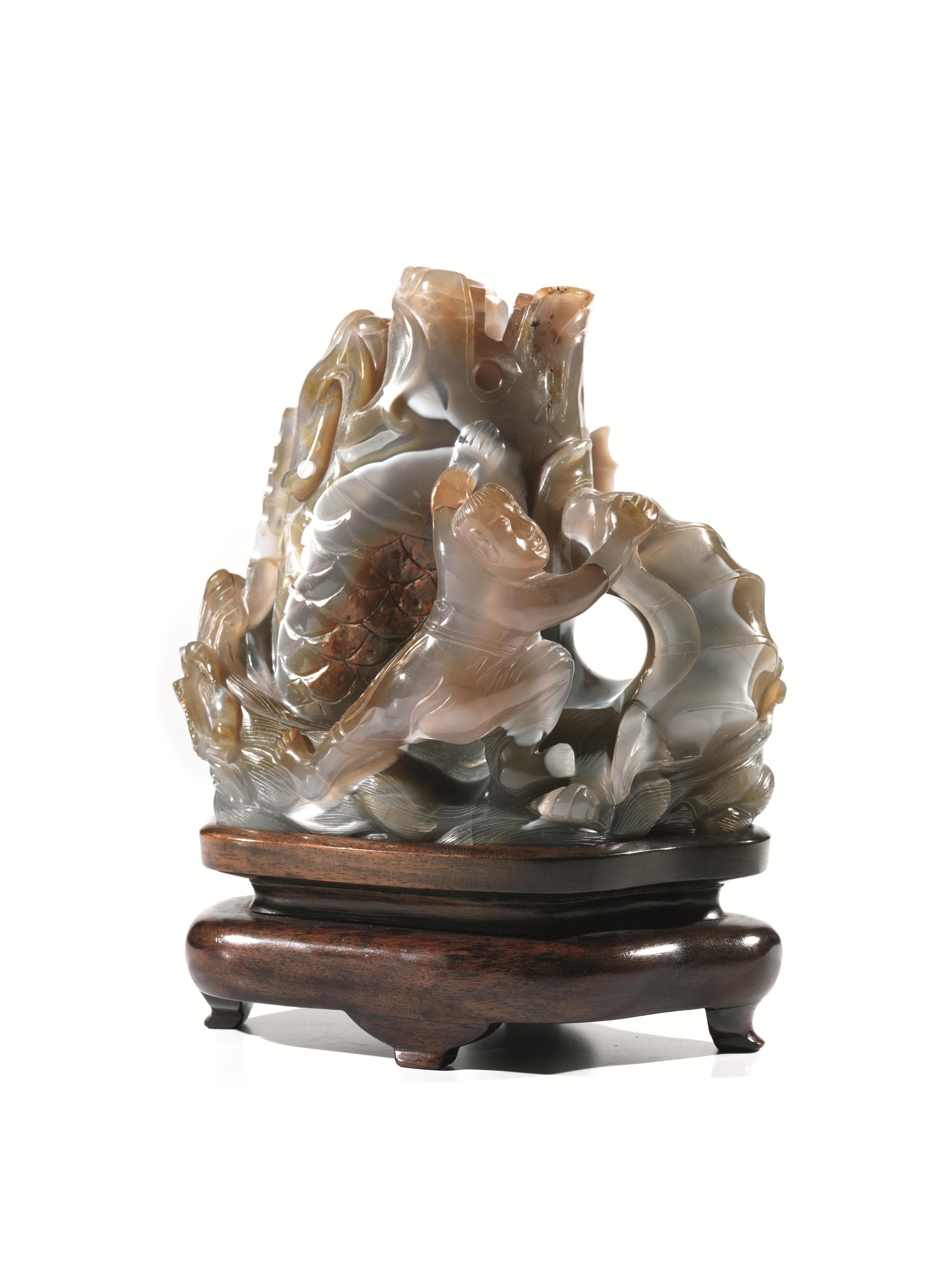 Scultura, Cina sec. XX, in calcedonio, raffigurante un pesce con un fanciullo, alt. cm 16,5, poggiante su base in legno