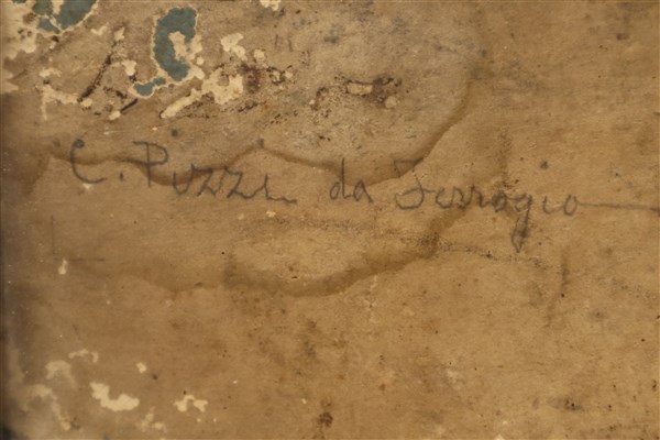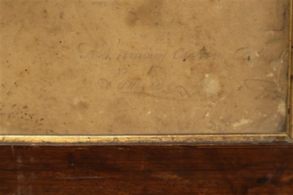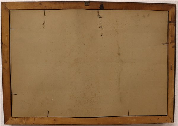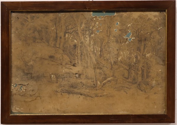 Antico disegno a tecnica mista raffigurante paesaggio boschivo con figure (mm 360x550) in cornice (gravi difetti)