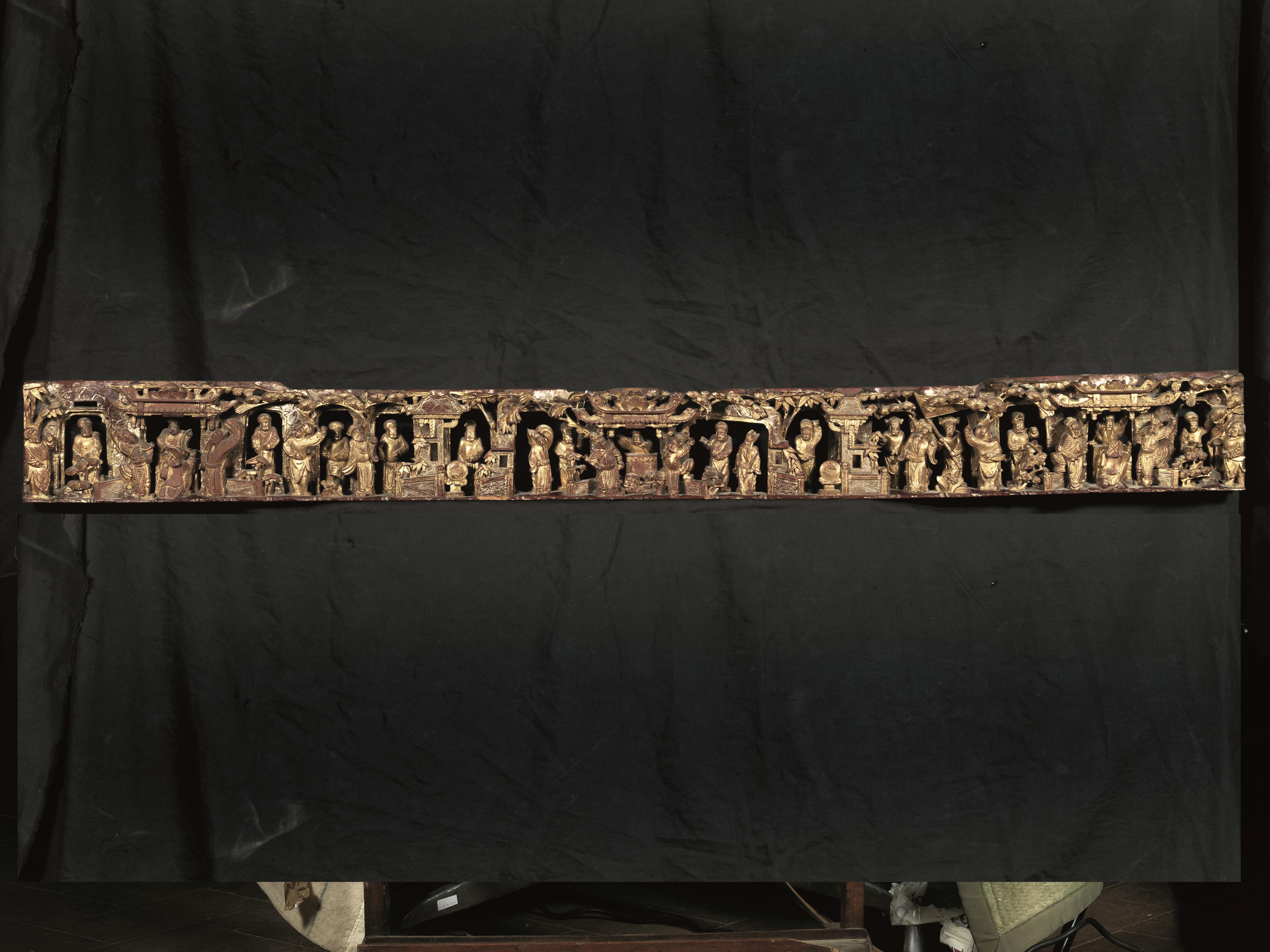 Pannello Cina fine dinastia Qing, in legno intagliato e dorato, finemente scolpito con moltitudine di personaggi e architetture, cm 142x14, difetti