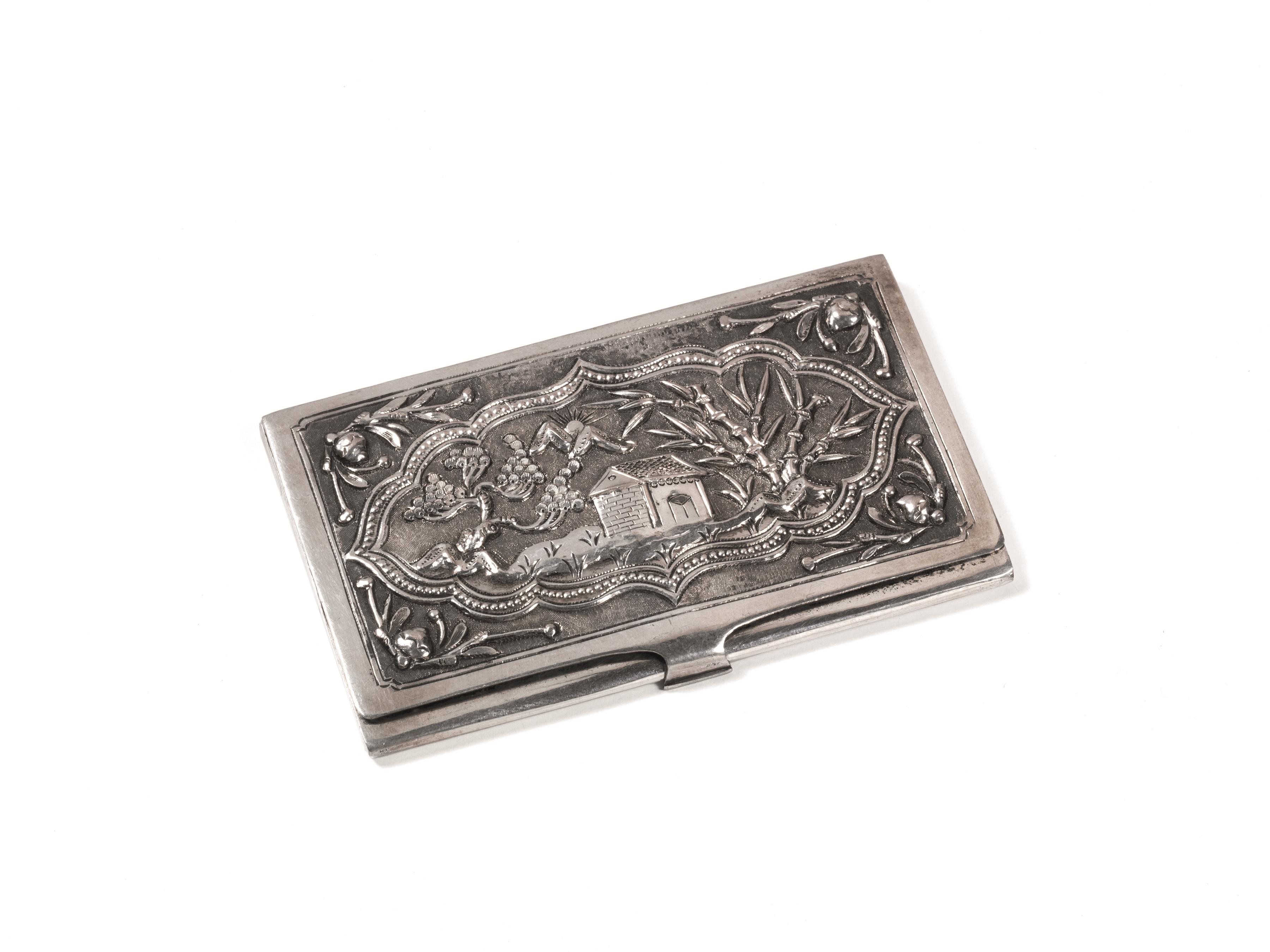 Porta biglietti inizi sec. XX, in argento il fronte cesellato con motivo a paesaggio, il recto con scena animata incisa, gr. 70, cm 9,5x5,8