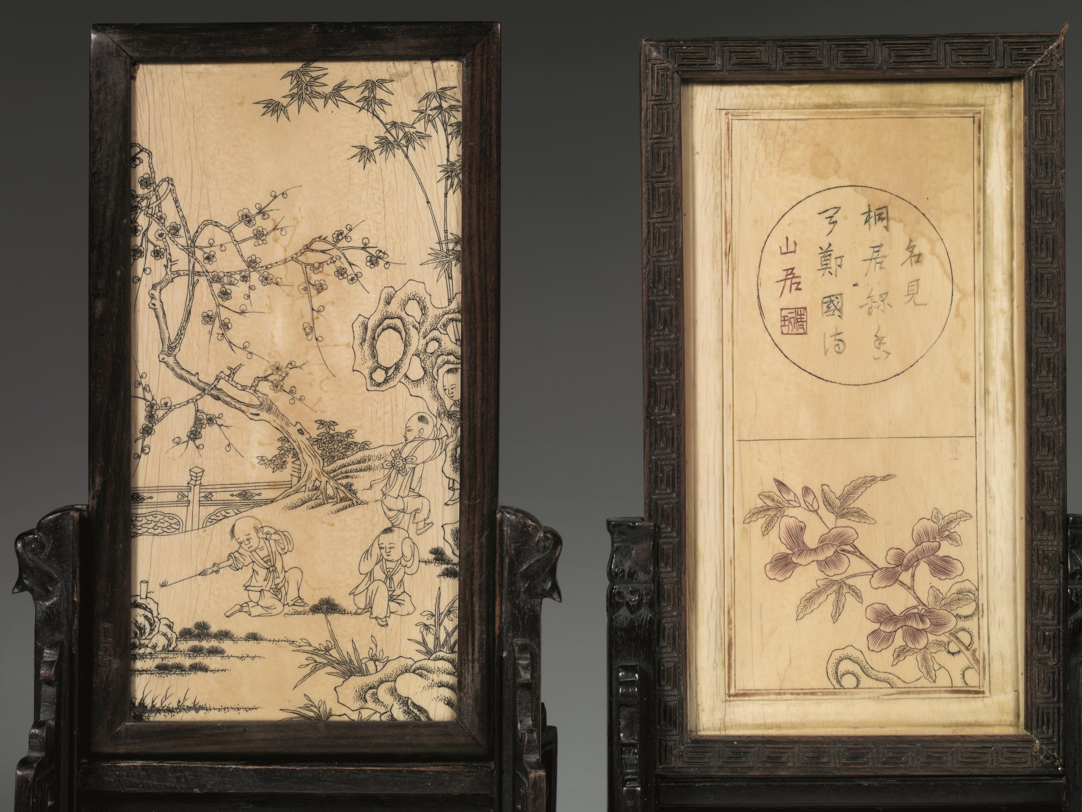 Due paraventi da tavolo, Cina dinastia Qing (1644-1911), in avorio decorato a...
