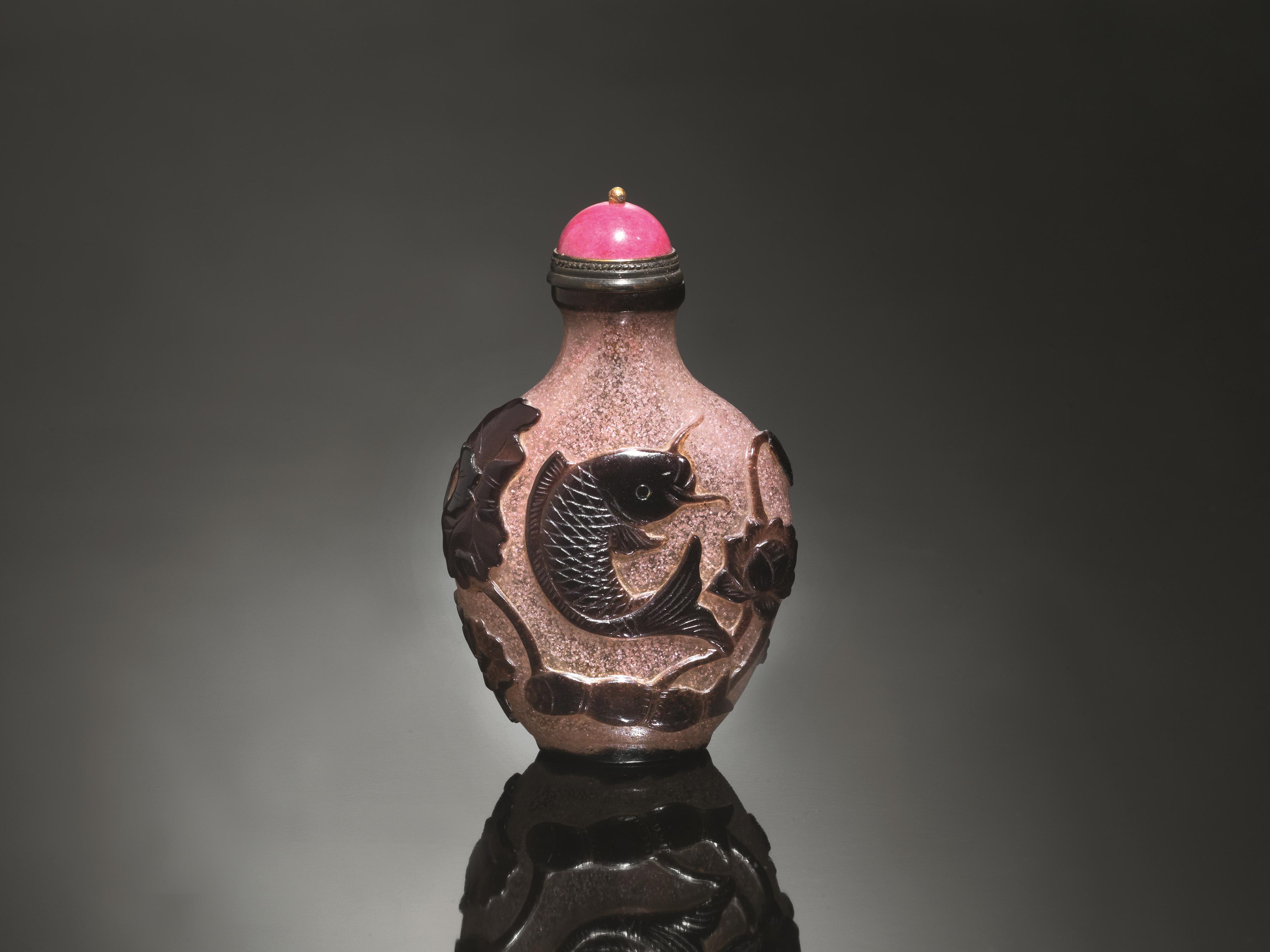 Snuff-bottle, Cina dinastia Qing (1644- 1911), in vetro incamiciato color