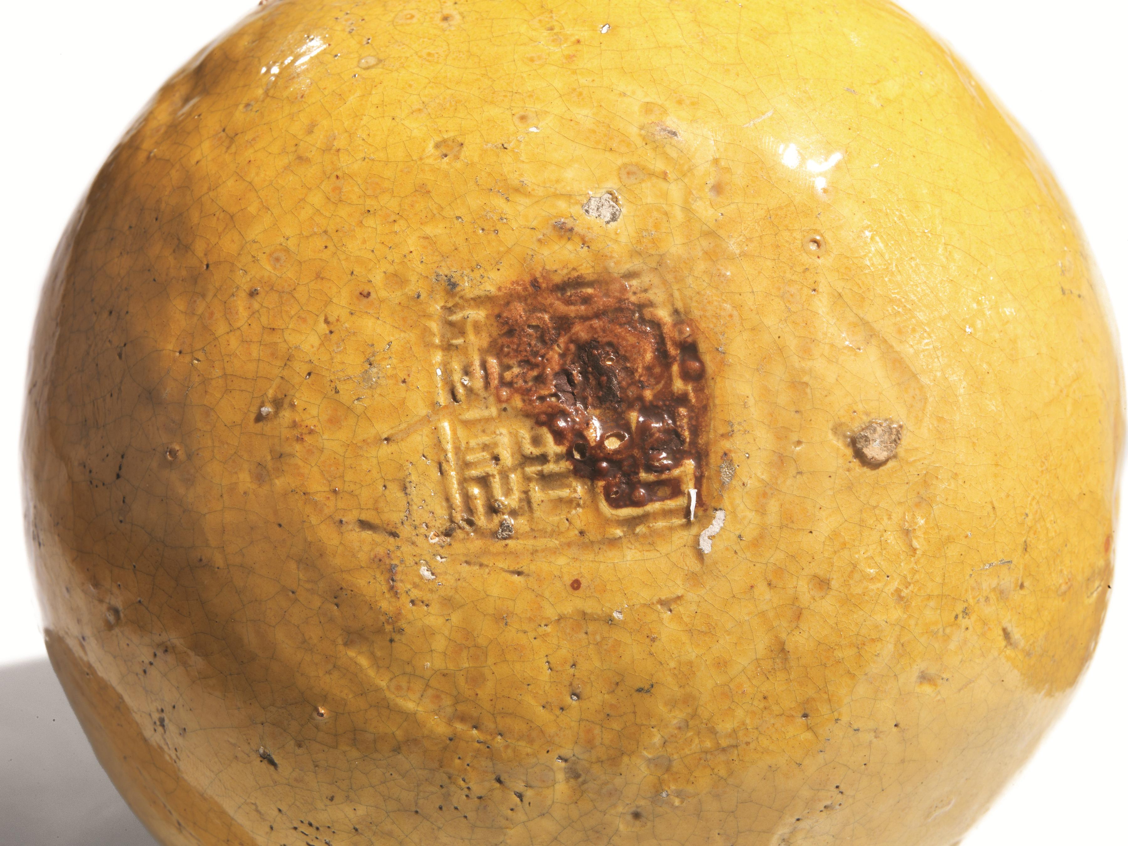Due frutti Cina fine dinastia Qing, in ceramica gialla marcati alla base, alt. cm 19 (2)