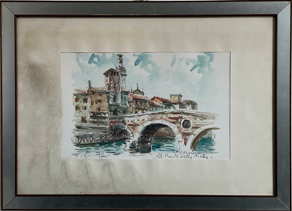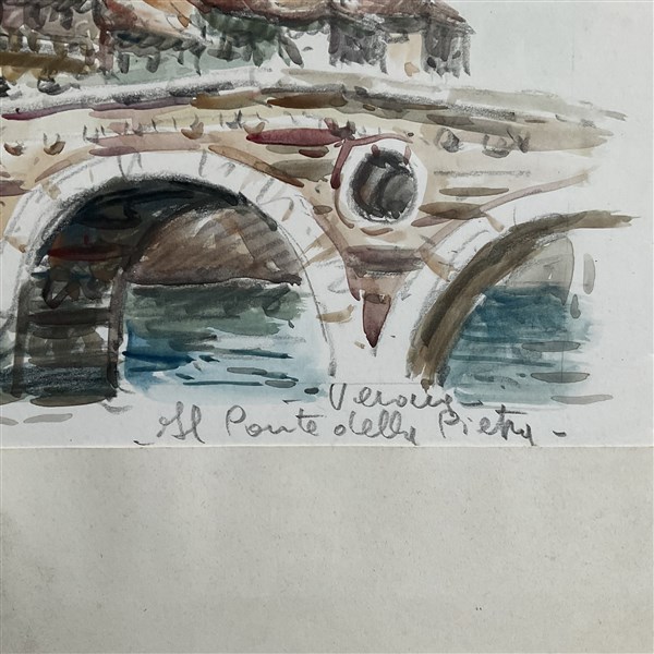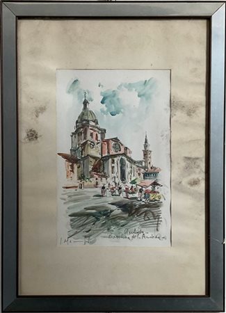 Lotto composto da tre acquarelli raffiguranti pescatore su spiaggia e scorci di città, di misure diverse (misura max cm 38x58) firmati e titolati in basso