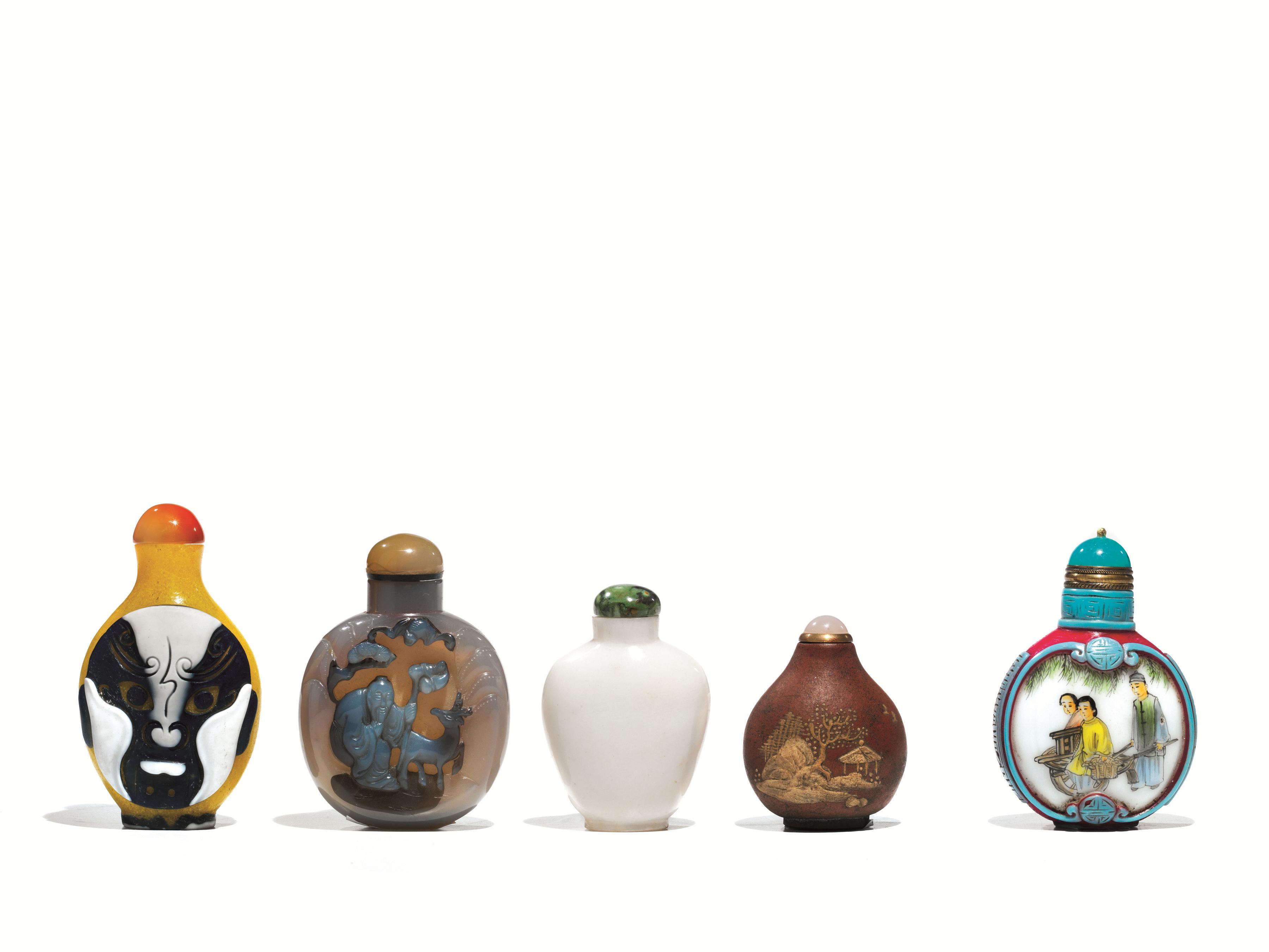 Quattro snuff-bottles, Cina inizi sec. XX, in materiali diversi, una in vetro