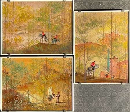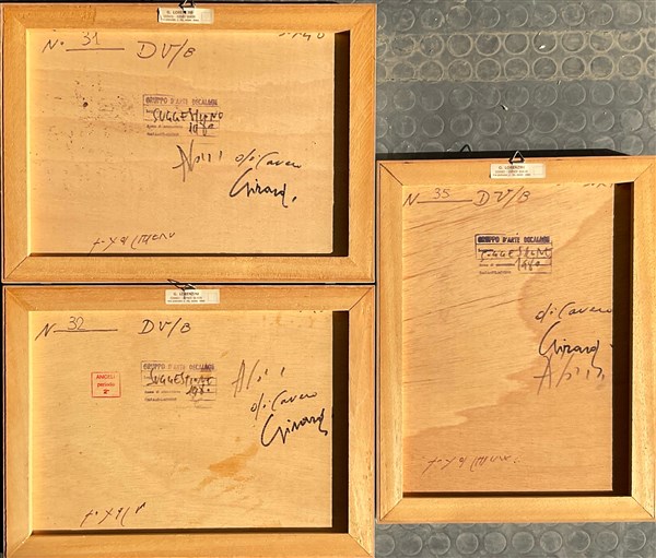 "Suggestione" 1980, lotto composto da tre tecniche miste su compensato (cm 29,5x39,5), firmate in basso; timbro e firma degli artisti al verso