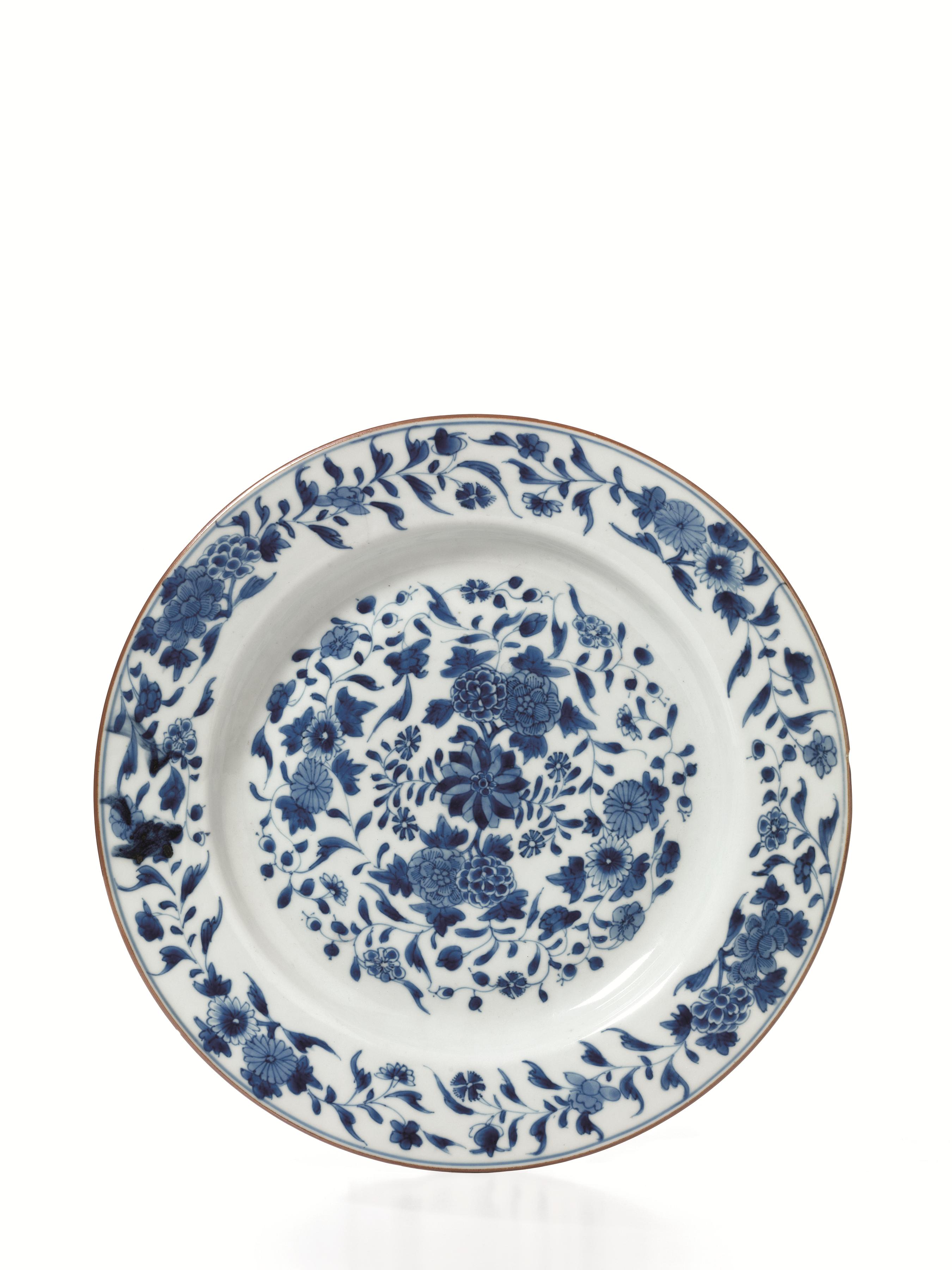 Piatto Cina dinastia Qing, sec. XVIII, in porcellana bianca e blu, finemente decorata a motivi floreali, diam. cm 32,4