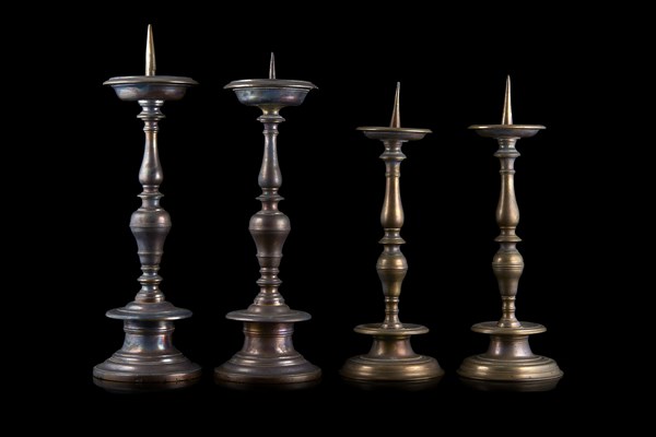 Collection of four candle holders of different decoration and age (h. max cm 35)