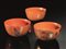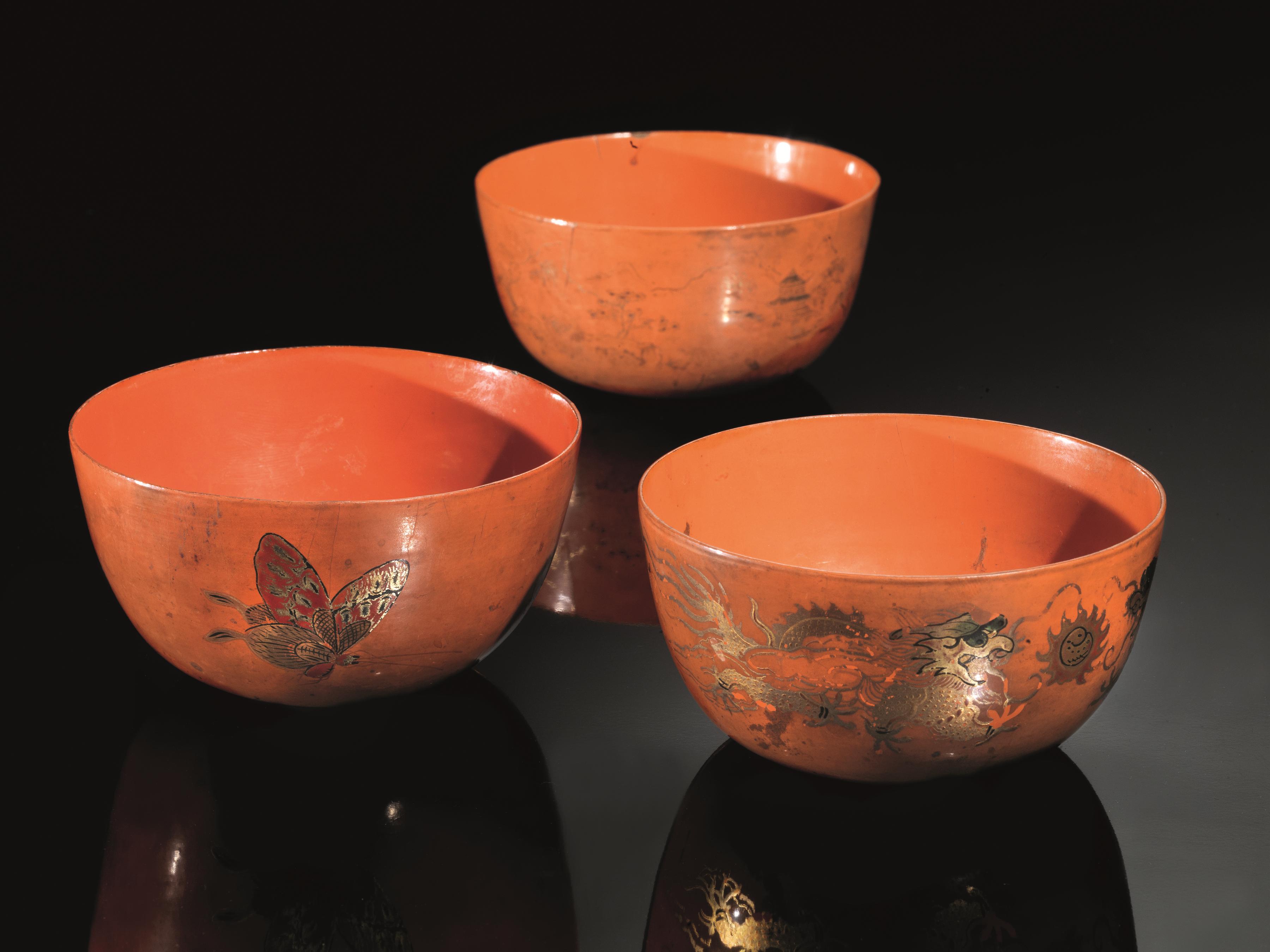 Tre ciotole, Giappone sec. XIX, in lacca arancione, decorate a paesaggio, figure e