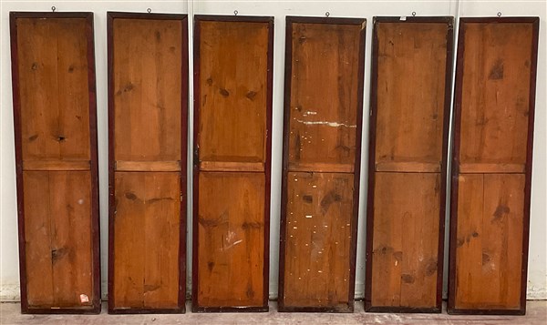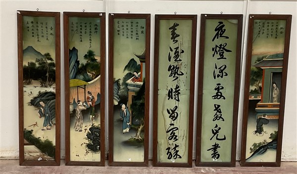 Gruppo di sei pannelli dipinti su vetro con pittogrammi e scene di vita, in cornici (cm 96x25) (difetti)