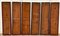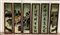 Gruppo di sei pannelli dipinti su vetro con pittogrammi e scene di vita, in cor