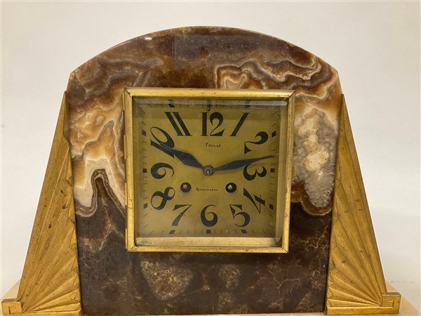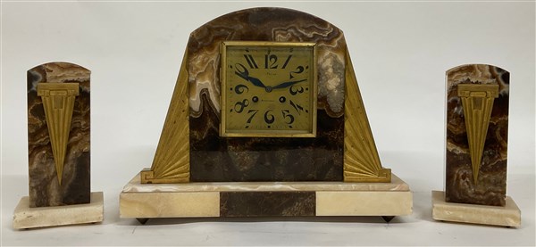 FOULAZ, ANNEMASSE. Trittico da camino in onice e bronzi dorati di gusto déco composto da un orologio e due elementi decorativi. Quadrante in metallo dorato a numeri arabi, movimento a due treni con suoneria delle ore e mezze. Inizio secolo XX (cm 39x30x13) (difetti)